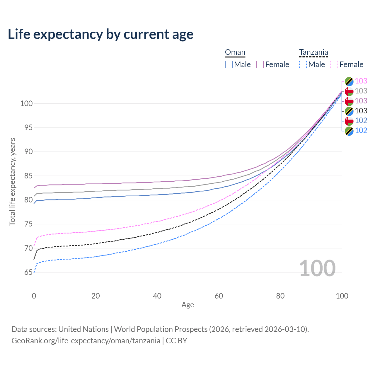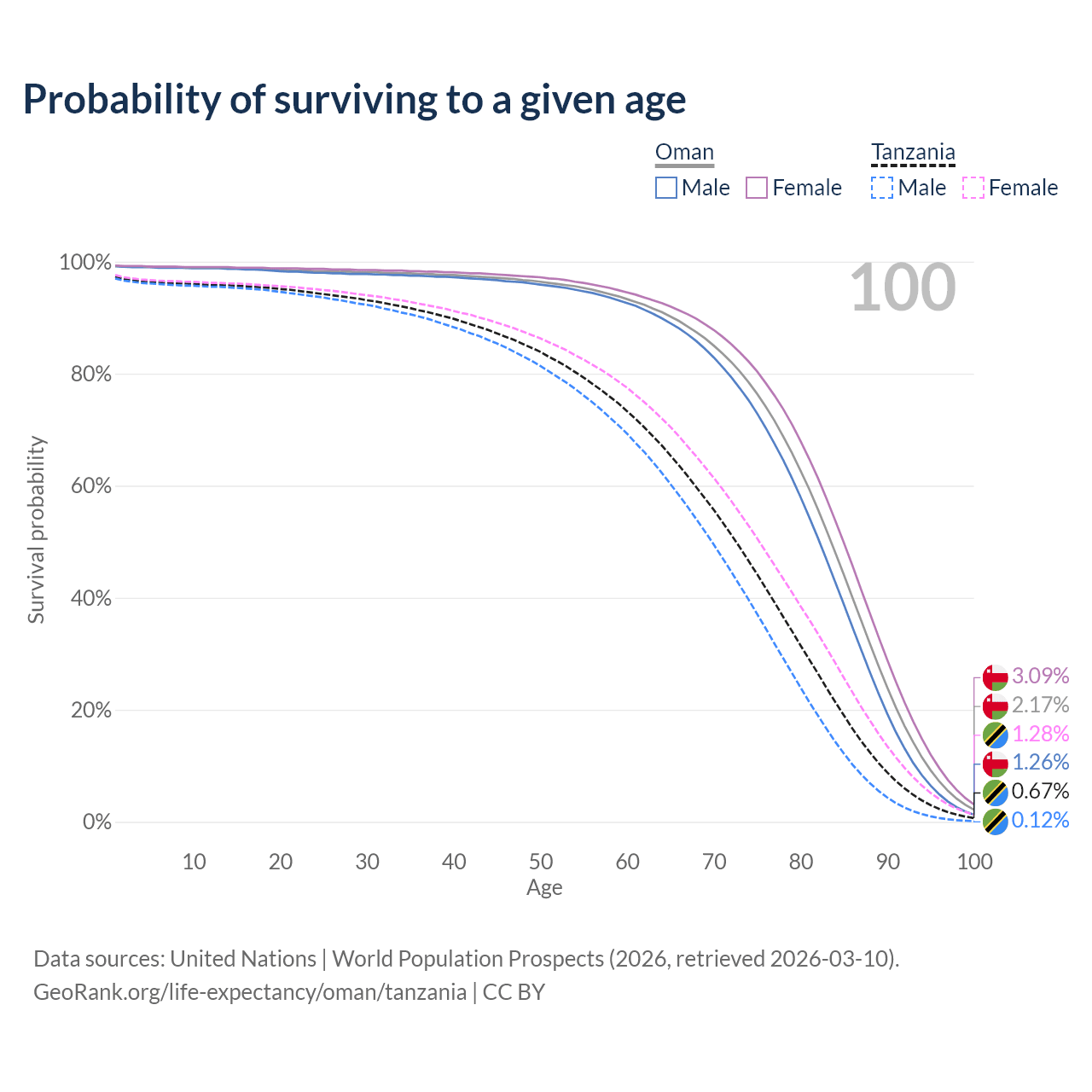 This life expectancy calculator shows the odds of living to 100, 95, 90, and below based on current age for both males and females in Oman and Tanzania, along with mean and median age of death. The calculations are based on the 2026 life tables (actuarial tables) from the UN World Population Prospects.