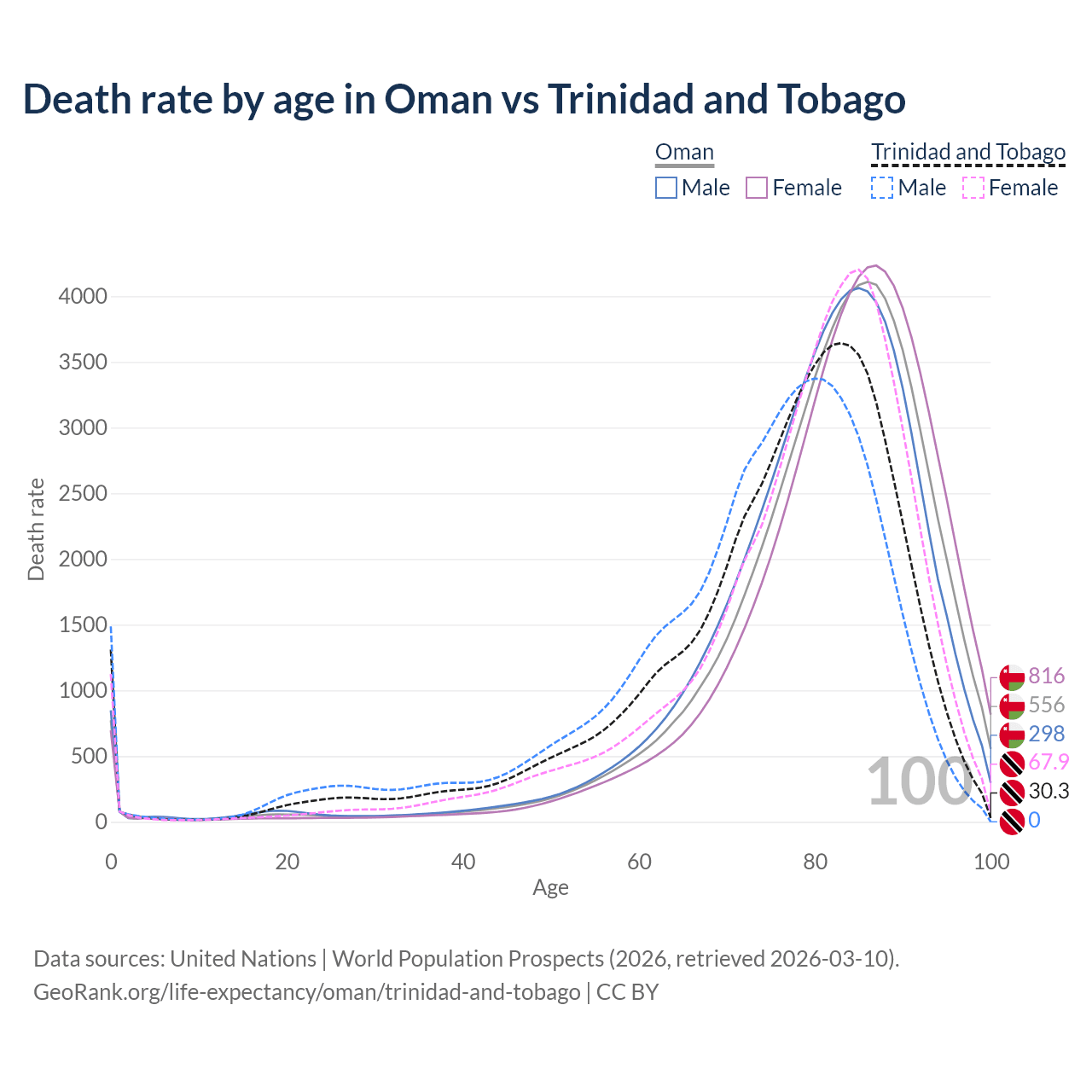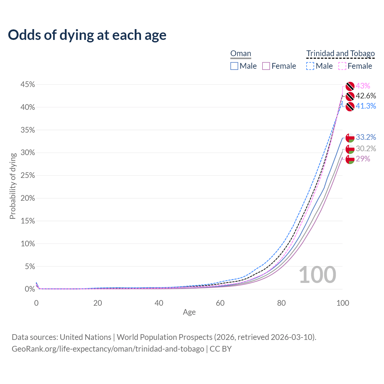 This life expectancy calculator shows the odds of living to 100, 95, 90, and below based on current age for both males and females in Oman and Trinidad and Tobago, along with mean and median age of death. The calculations are based on the 2026 life tables (actuarial tables) from the UN World Population Prospects.