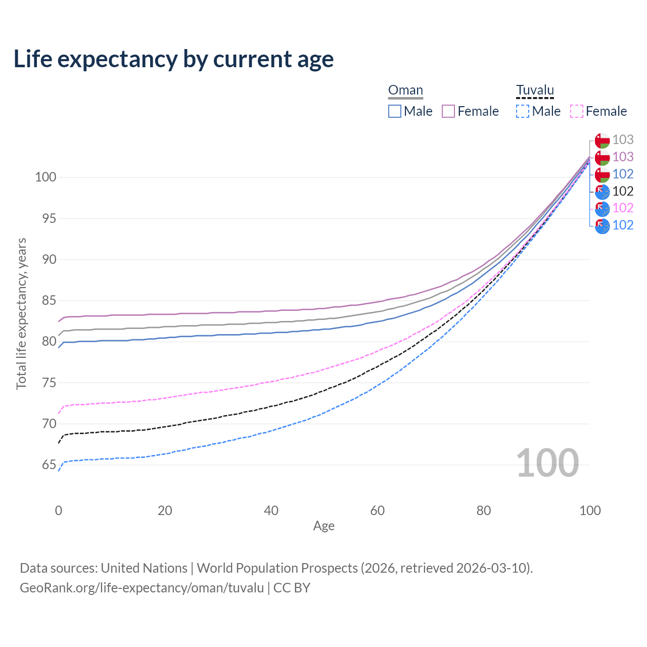 This life expectancy calculator shows the odds of living to 100, 95, 90, and below based on current age for both males and females in Oman and Tuvalu, along with mean and median age of death. The calculations are based on the 2026 life tables (actuarial tables) from the UN World Population Prospects.