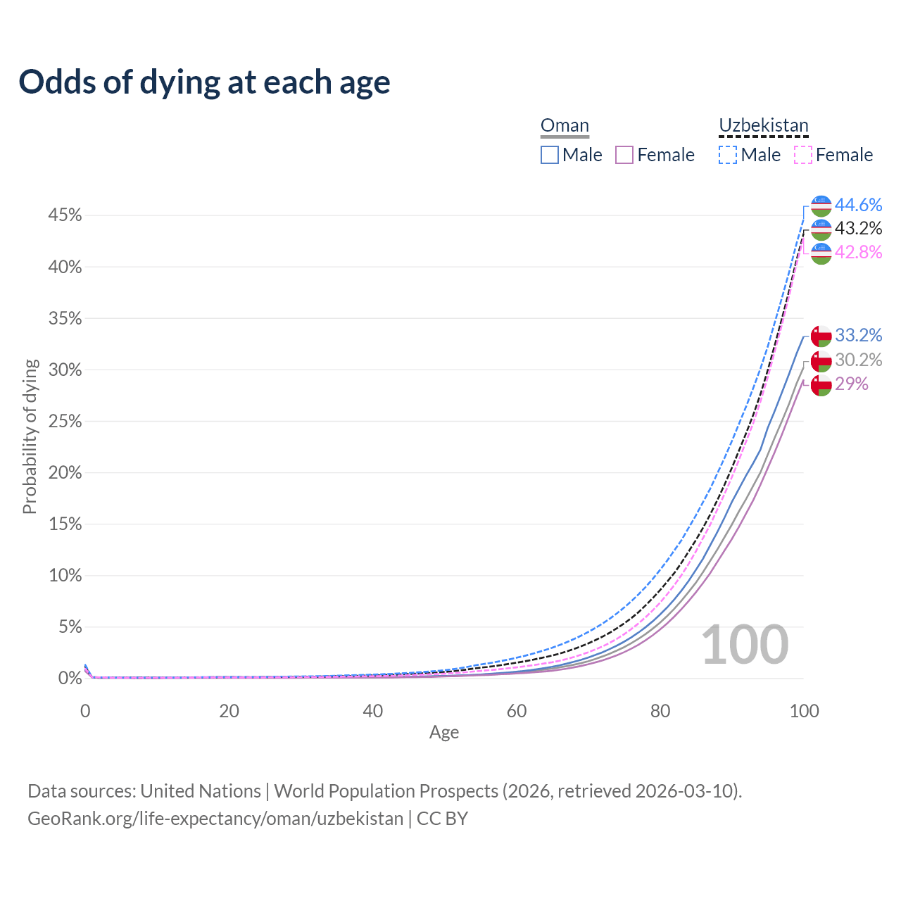 This life expectancy calculator shows the odds of living to 100, 95, 90, and below based on current age for both males and females in Oman and Uzbekistan, along with mean and median age of death. The calculations are based on the 2026 life tables (actuarial tables) from the UN World Population Prospects.