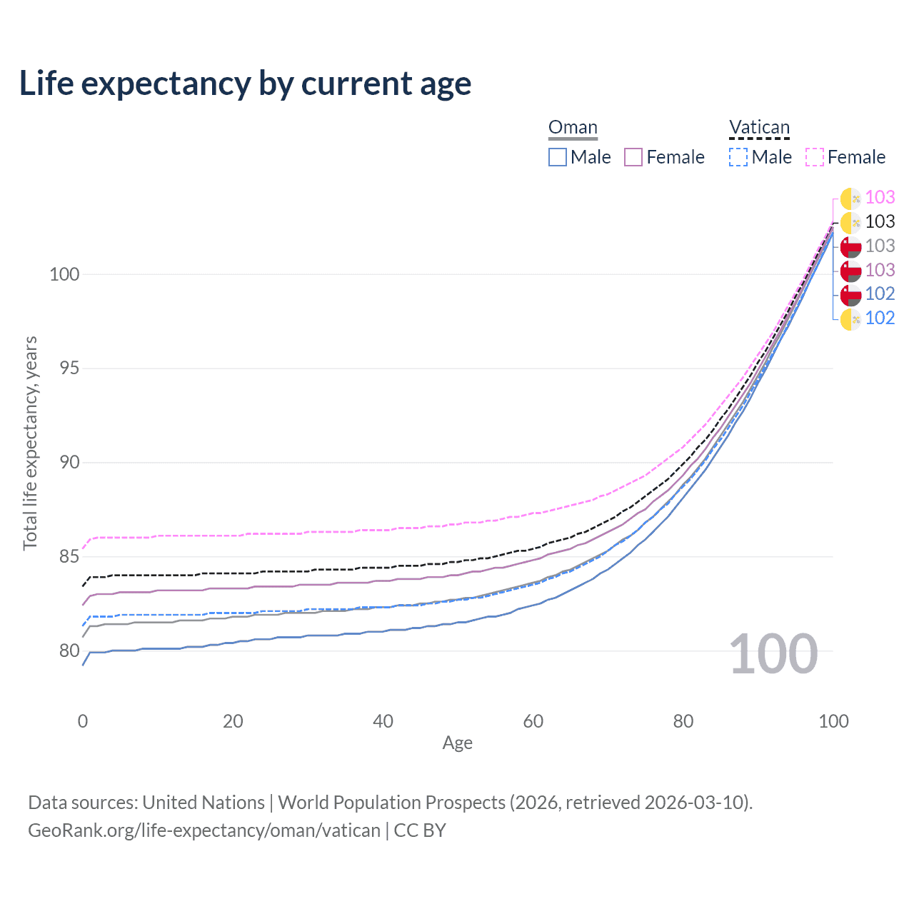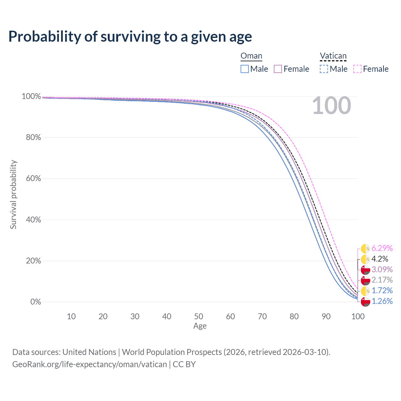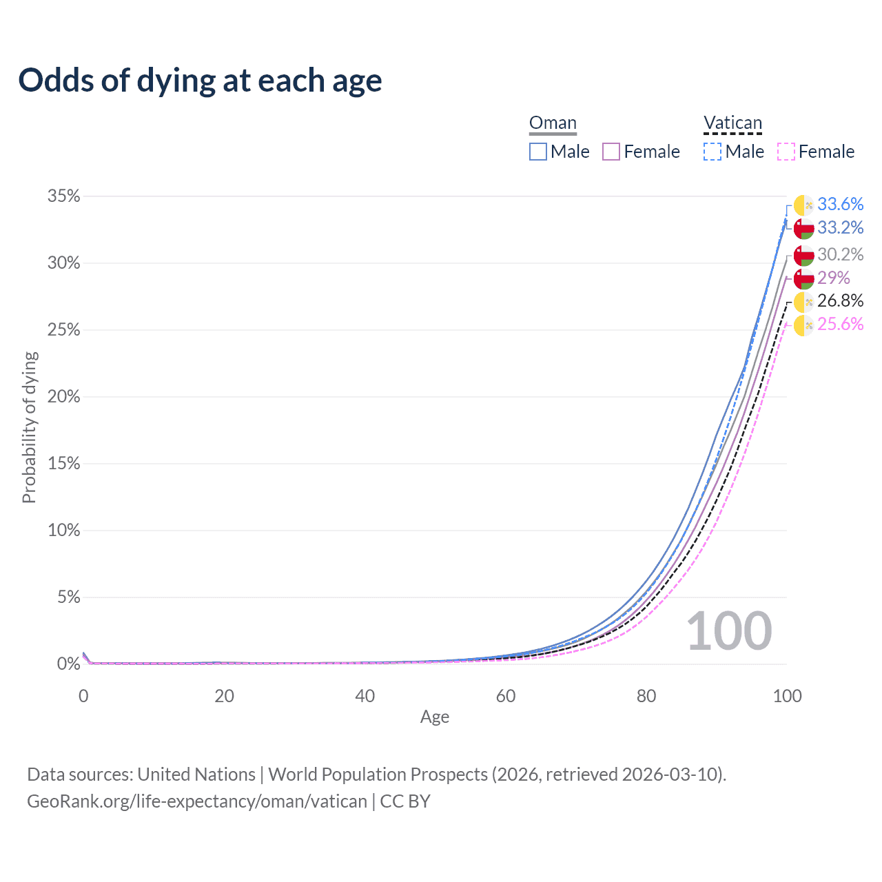 This life expectancy calculator shows the odds of living to 100, 95, 90, and below based on current age for both males and females in Oman and the Vatican, along with mean and median age of death. The calculations are based on the 2026 life tables (actuarial tables) from the UN World Population Prospects.