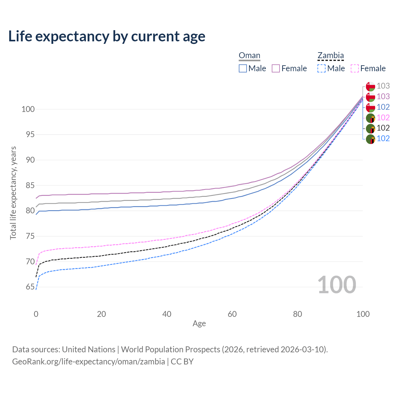This life expectancy calculator shows the odds of living to 100, 95, 90, and below based on current age for both males and females in Oman and Zambia, along with mean and median age of death. The calculations are based on the 2026 life tables (actuarial tables) from the UN World Population Prospects.