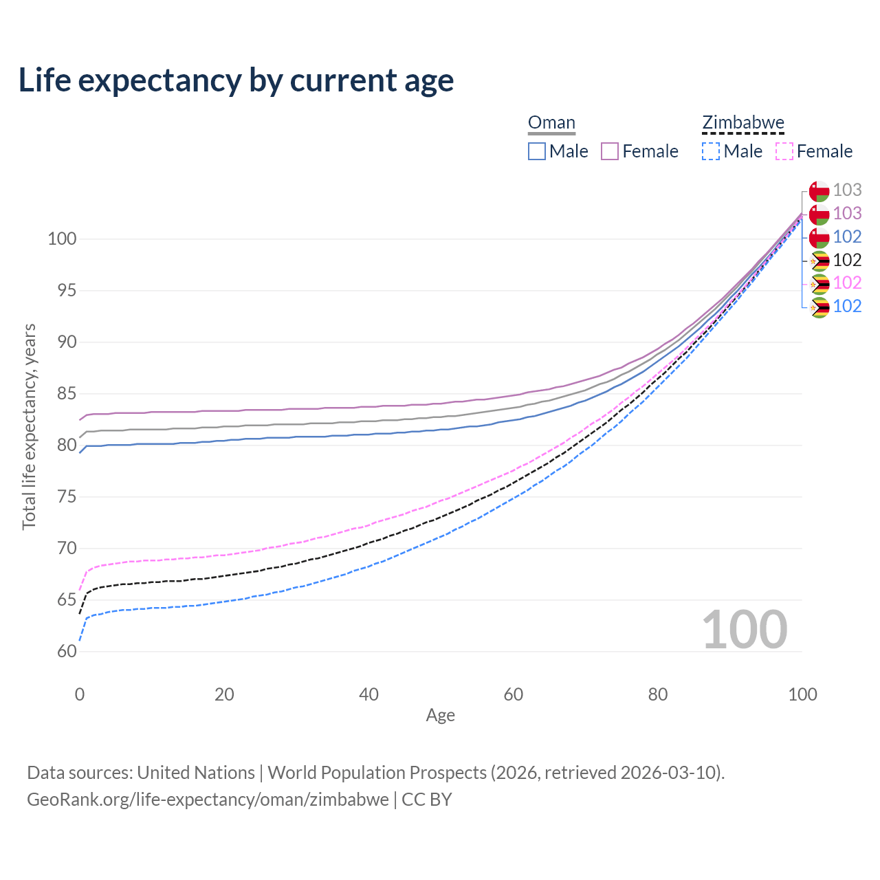 This life expectancy calculator shows the odds of living to 100, 95, 90, and below based on current age for both males and females in Oman and Zimbabwe, along with mean and median age of death. The calculations are based on the 2026 life tables (actuarial tables) from the UN World Population Prospects.