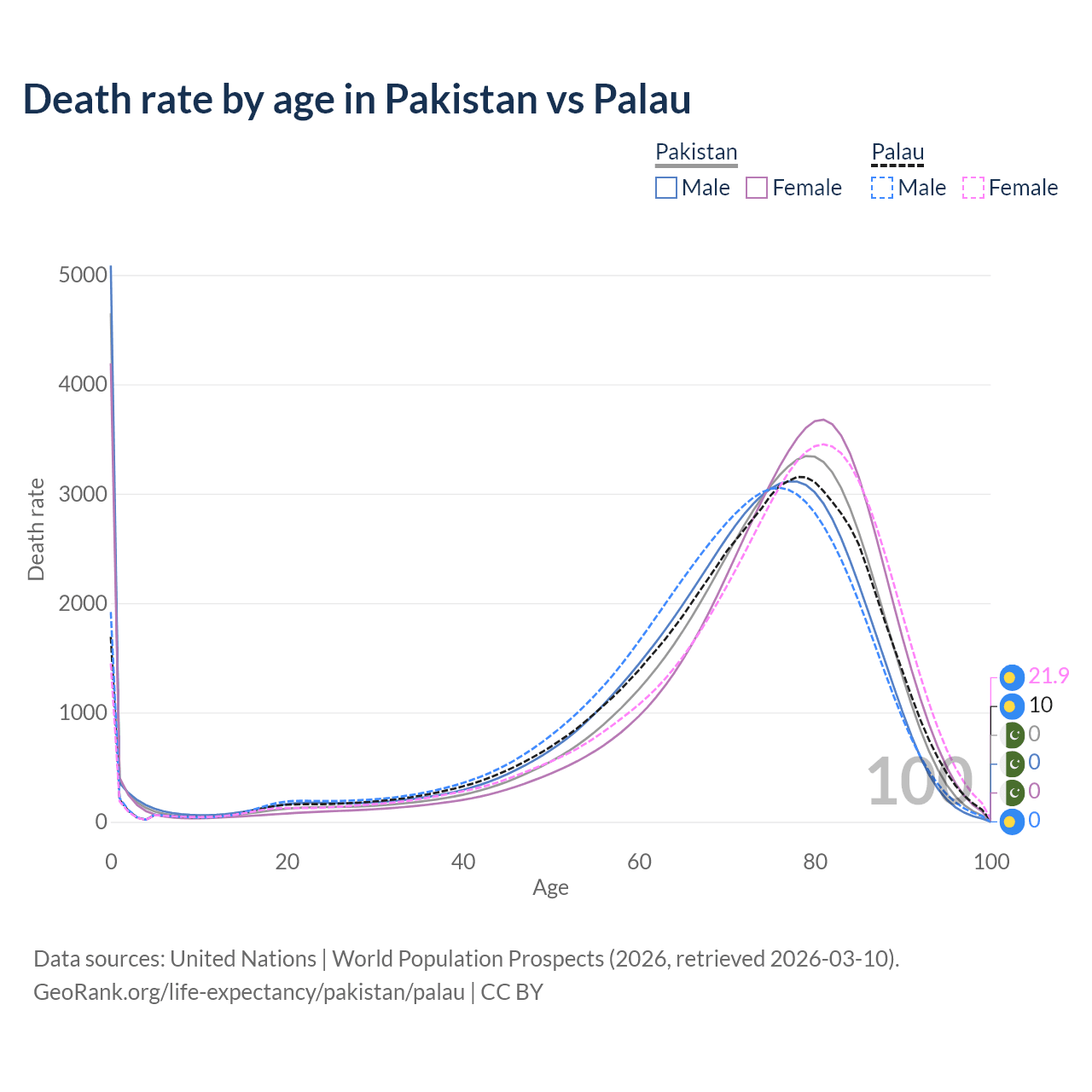 In Pakistan, the most common age of death is 0, compared to 78 in Palau. The median age of death is 74.3 in Pakistan and 73.8 in Palau, meaning only half of each cohort is expected to live past that age.