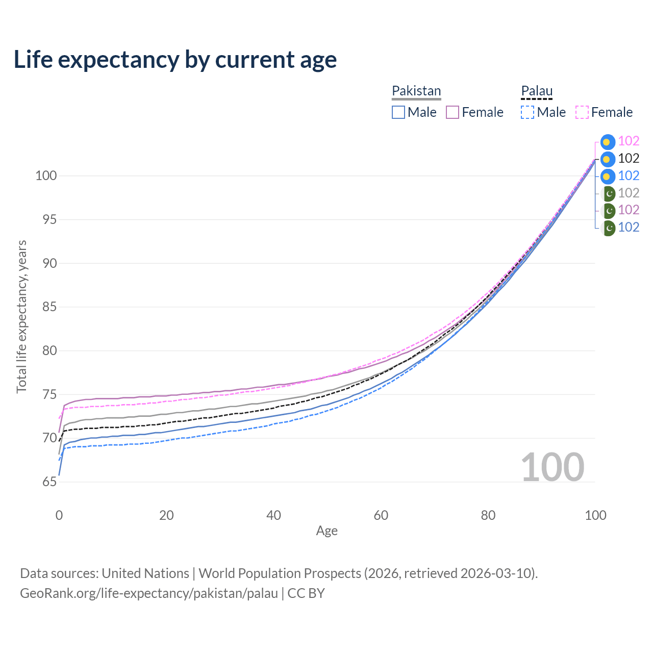 This life expectancy calculator shows the odds of living to 100, 95, 90, and below based on current age for both males and females in Pakistan and Palau, along with mean and median age of death. The calculations are based on the 2026 life tables (actuarial tables) from the UN World Population Prospects.