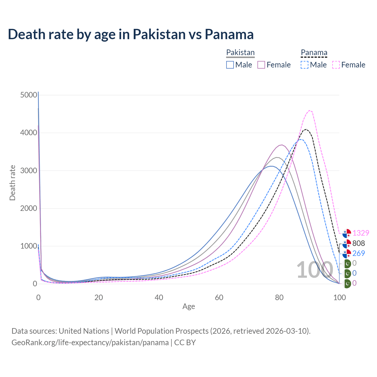 In Pakistan, the most common age of death is 0, compared to 89 in Panama. The median age of death is 74.3 in Pakistan and 84.6 in Panama, meaning only half of each cohort is expected to live past that age.