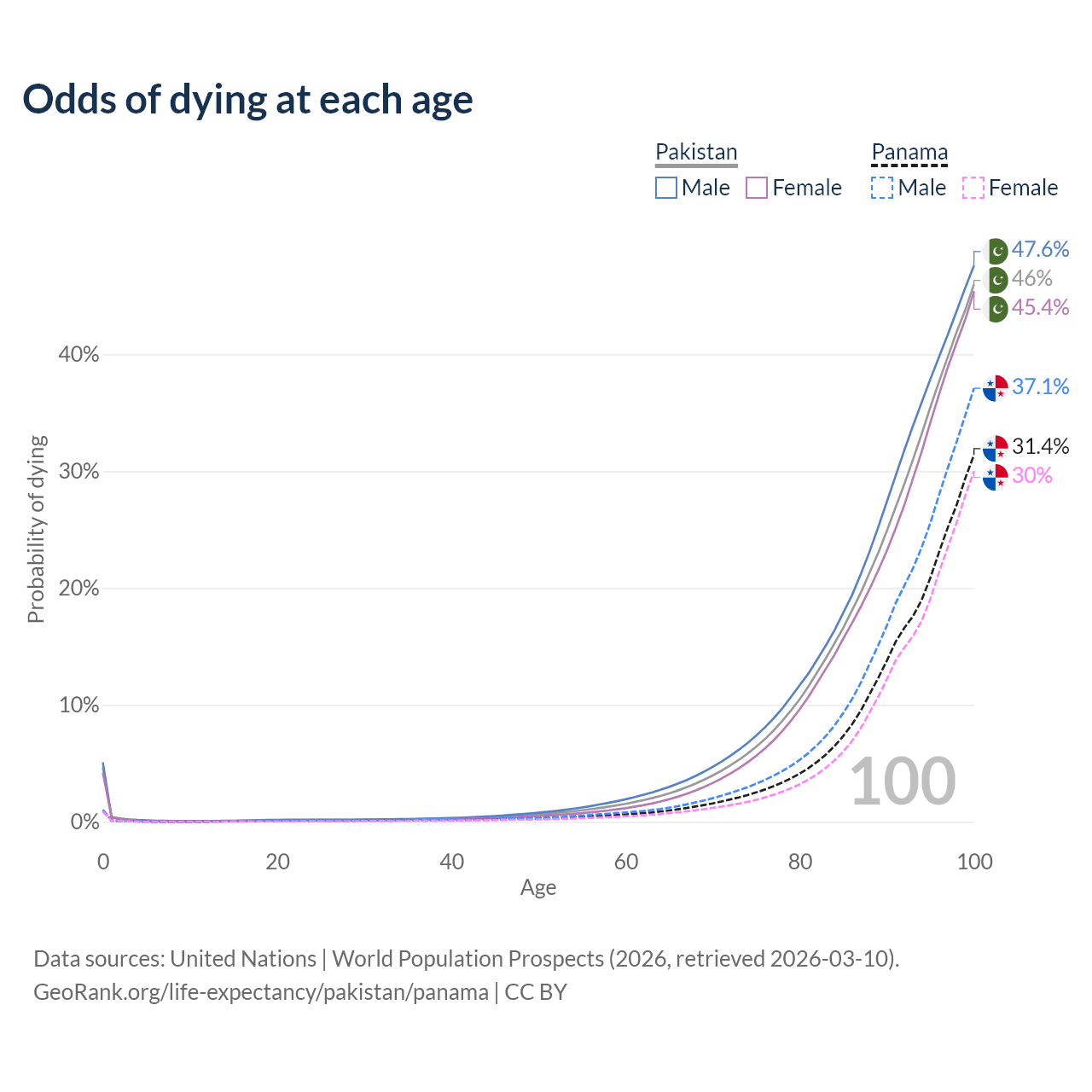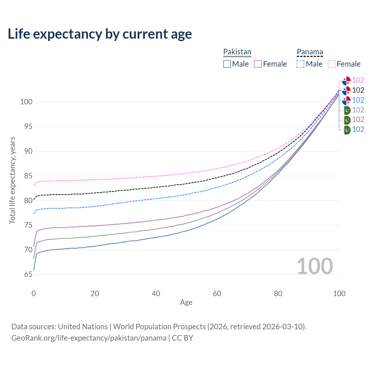 This life expectancy calculator shows the odds of living to 100, 95, 90, and below based on current age for both males and females in Pakistan and Panama, along with mean and median age of death. The calculations are based on the 2026 life tables (actuarial tables) from the UN World Population Prospects.