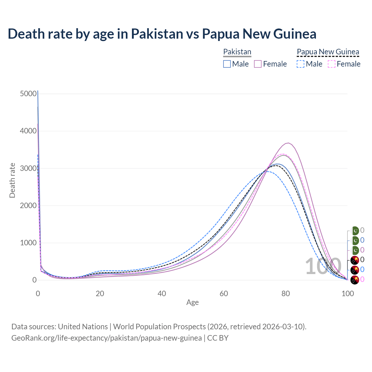 In Pakistan, the most common age of death is 0, compared to 0 in Papua New Guinea. The median age of death is 74.3 in Pakistan and 71.7 in Papua New Guinea, meaning only half of each cohort is expected to live past that age.