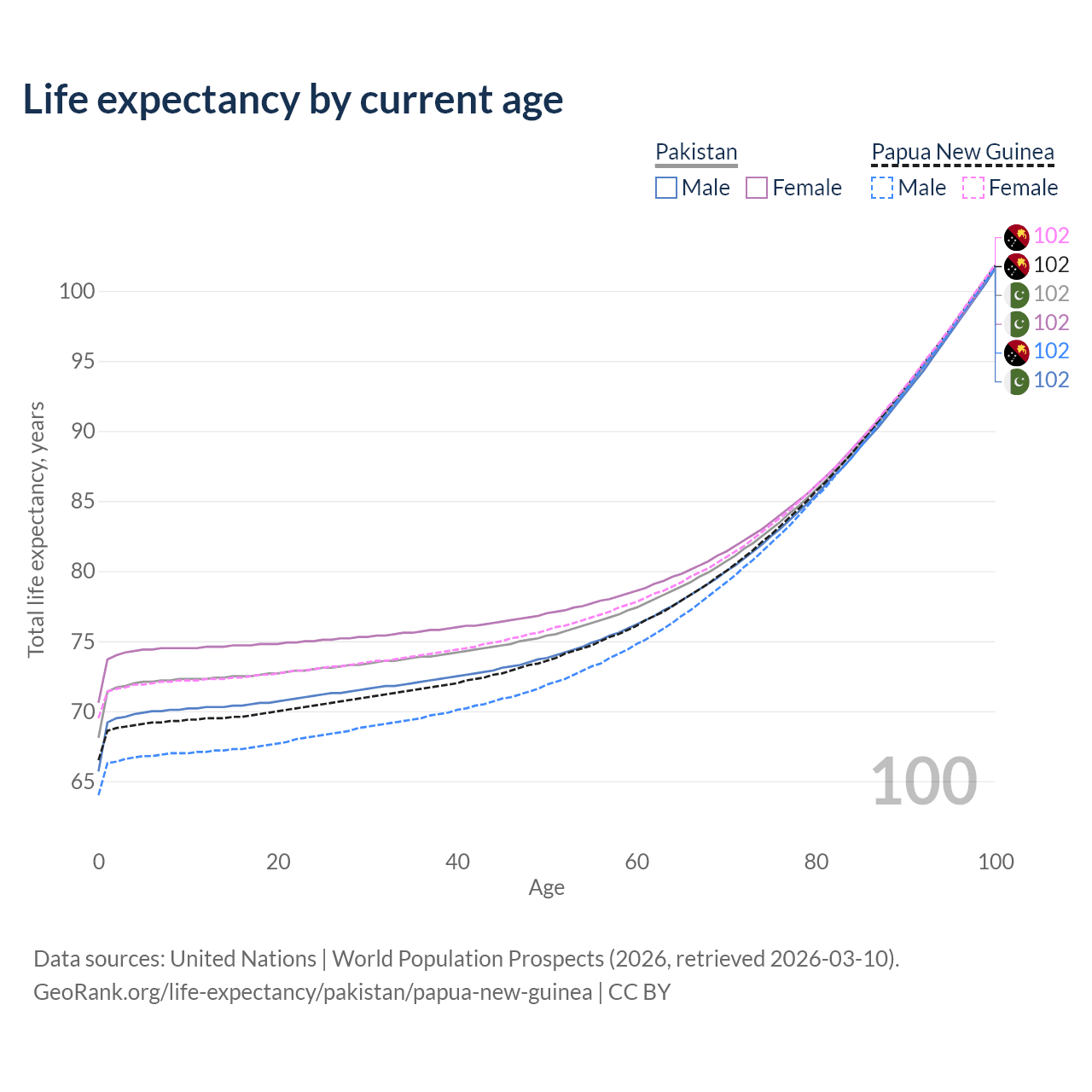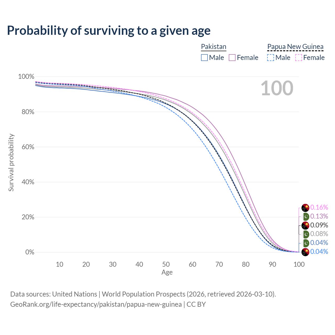 This life expectancy calculator shows the odds of living to 100, 95, 90, and below based on current age for both males and females in Pakistan and Papua New Guinea, along with mean and median age of death. The calculations are based on the 2026 life tables (actuarial tables) from the UN World Population Prospects.