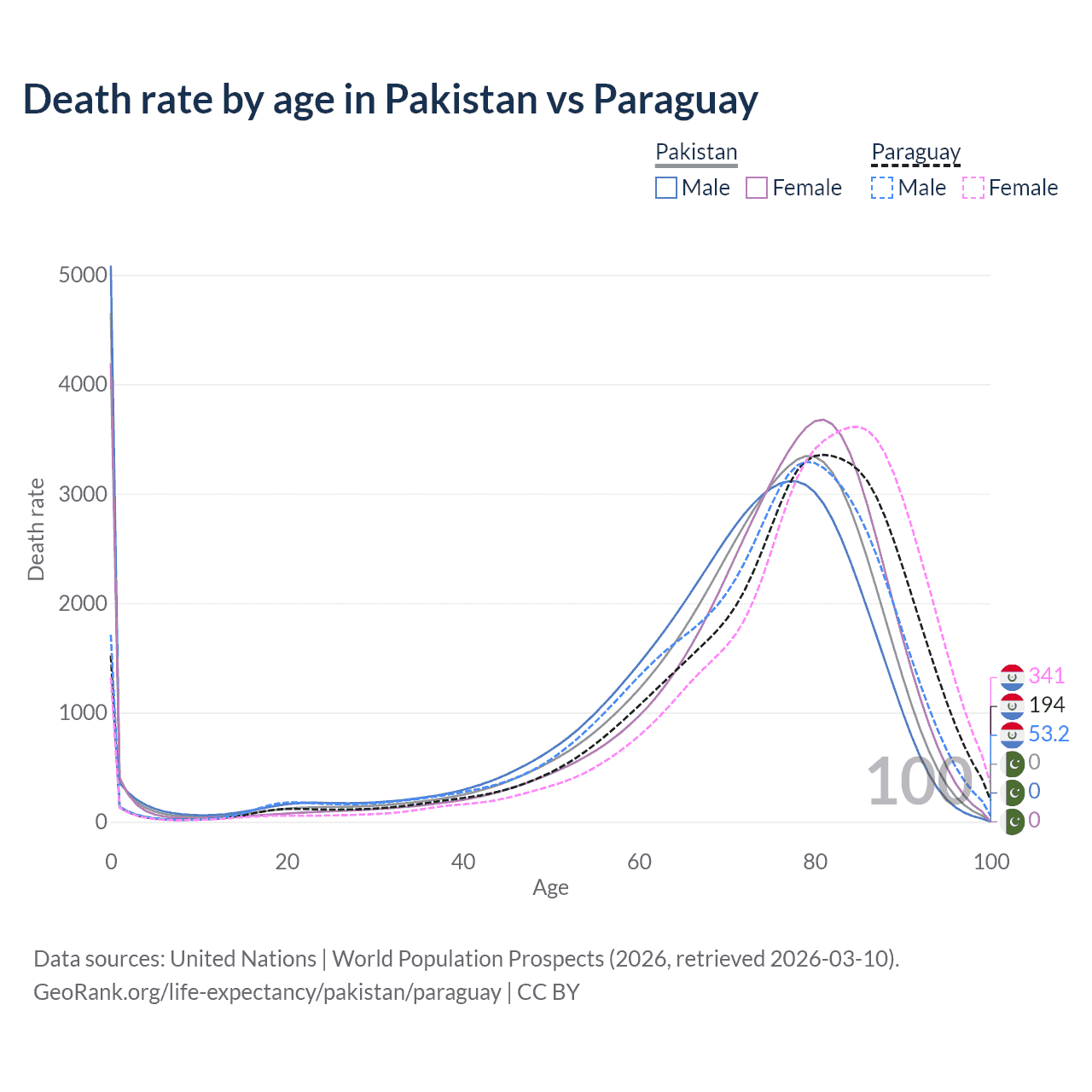 In Pakistan, the most common age of death is 0, compared to 81 in Paraguay. The median age of death is 74.3 in Pakistan and 78.4 in Paraguay, meaning only half of each cohort is expected to live past that age.