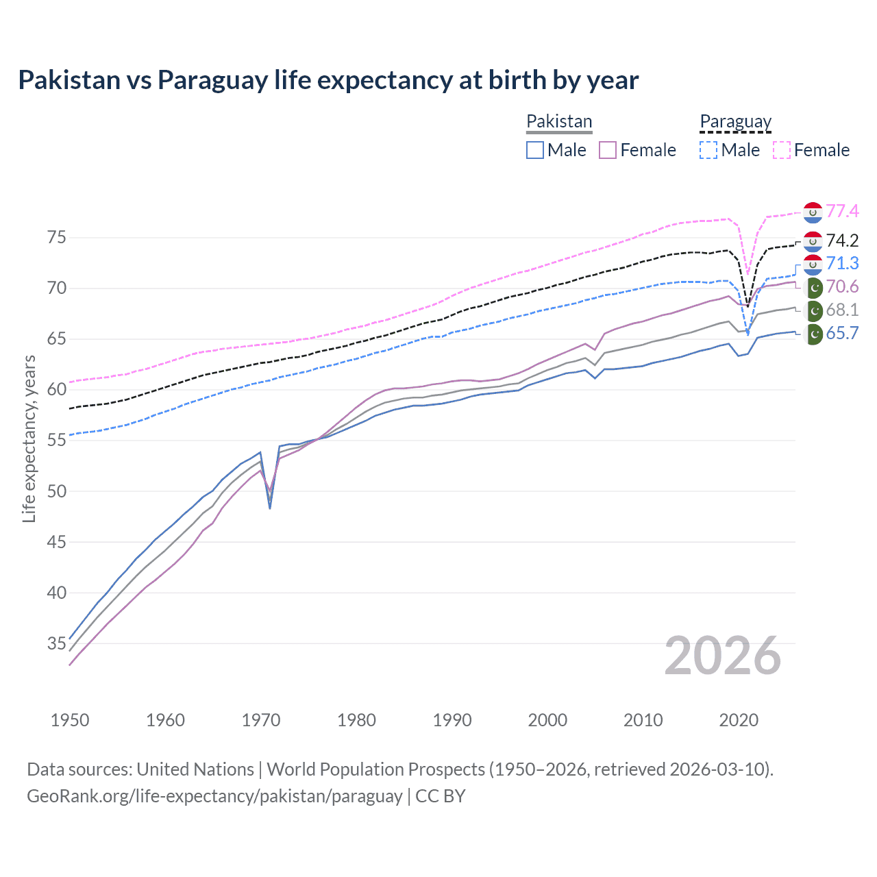 The average life expectancy at birth is 68.1 years in Pakistan vs 74.2 in Paraguay. Pakistan is ranked 151/197 by life expectancy, and Paraguay is 100/197. In Pakistan, the life expectancy is 65.7 years for males and 70.6 years for females. In Paraguay, it's 71.3 years for males and 77.4 years for females.
