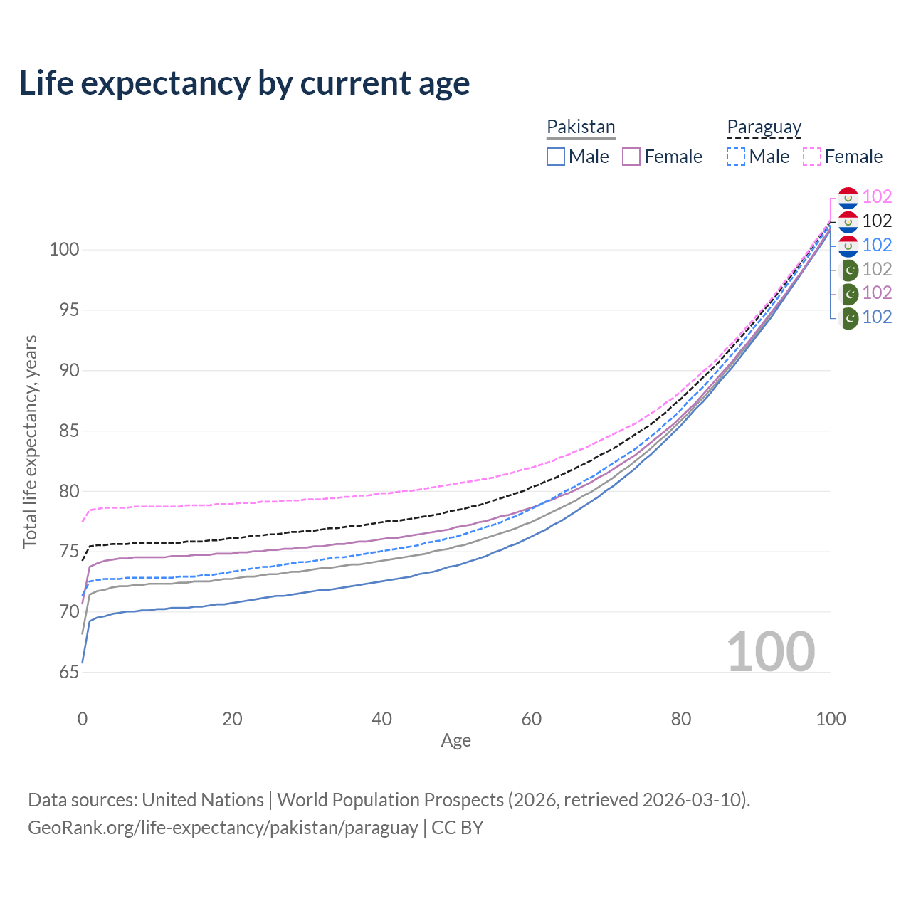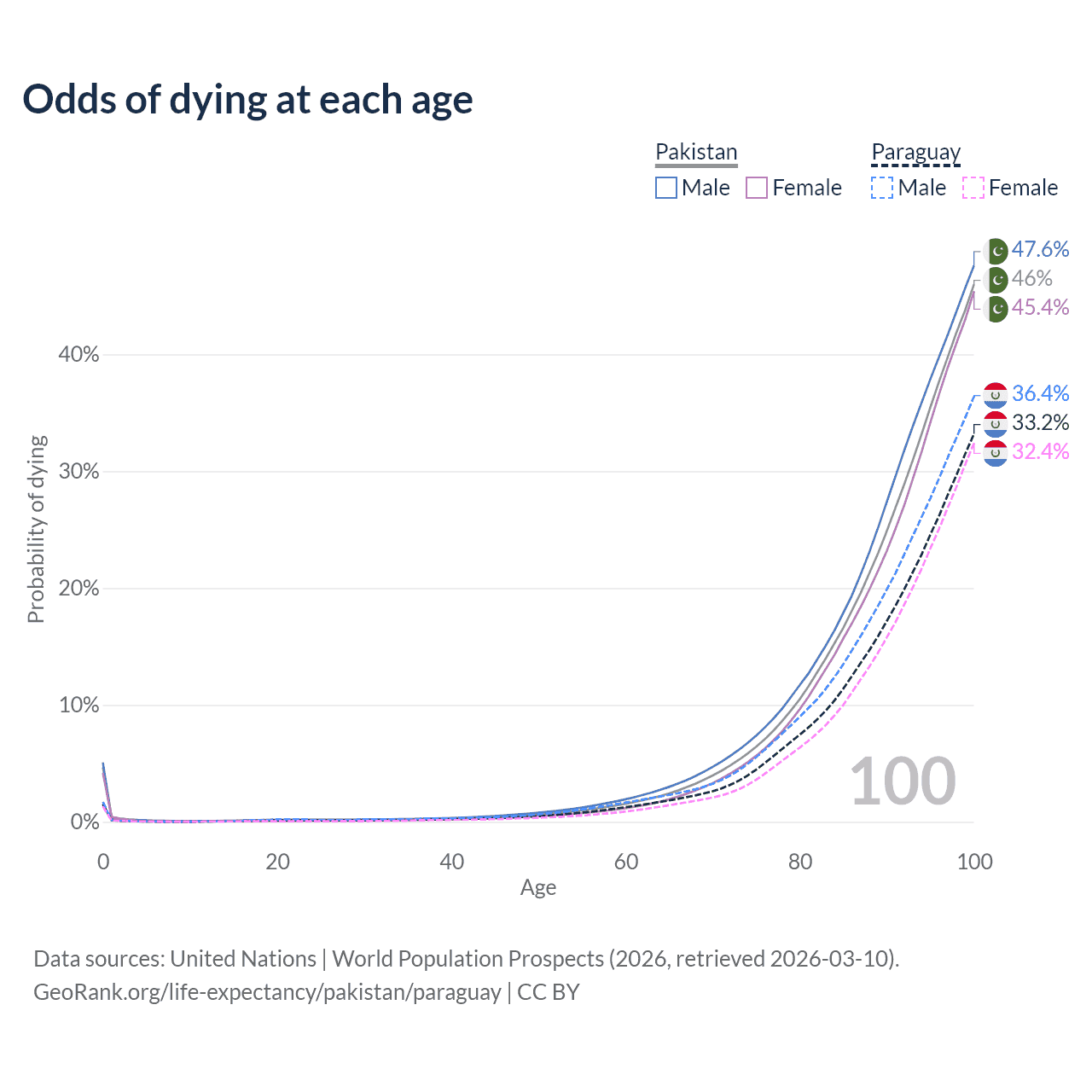 This life expectancy calculator shows the odds of living to 100, 95, 90, and below based on current age for both males and females in Pakistan and Paraguay, along with mean and median age of death. The calculations are based on the 2026 life tables (actuarial tables) from the UN World Population Prospects.
