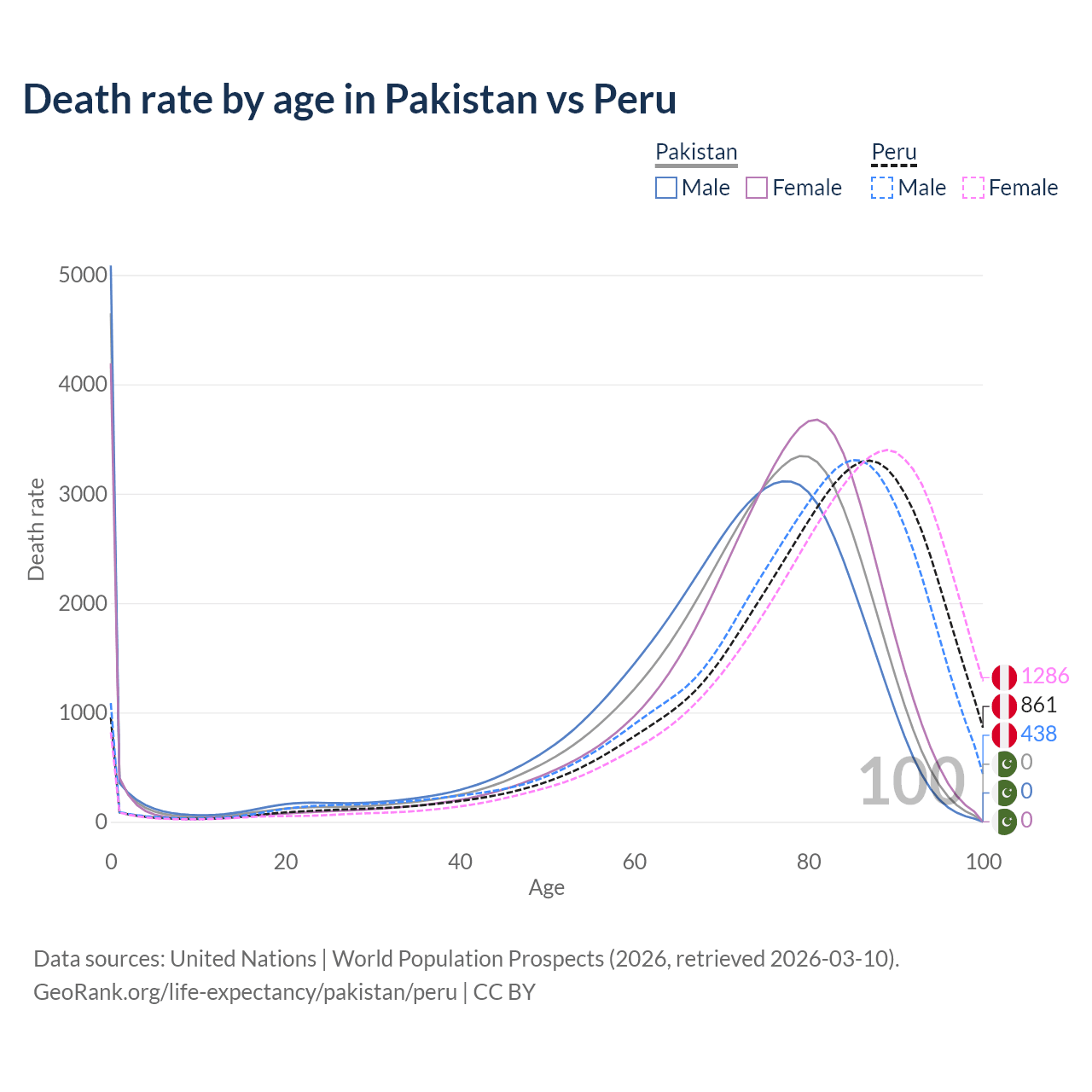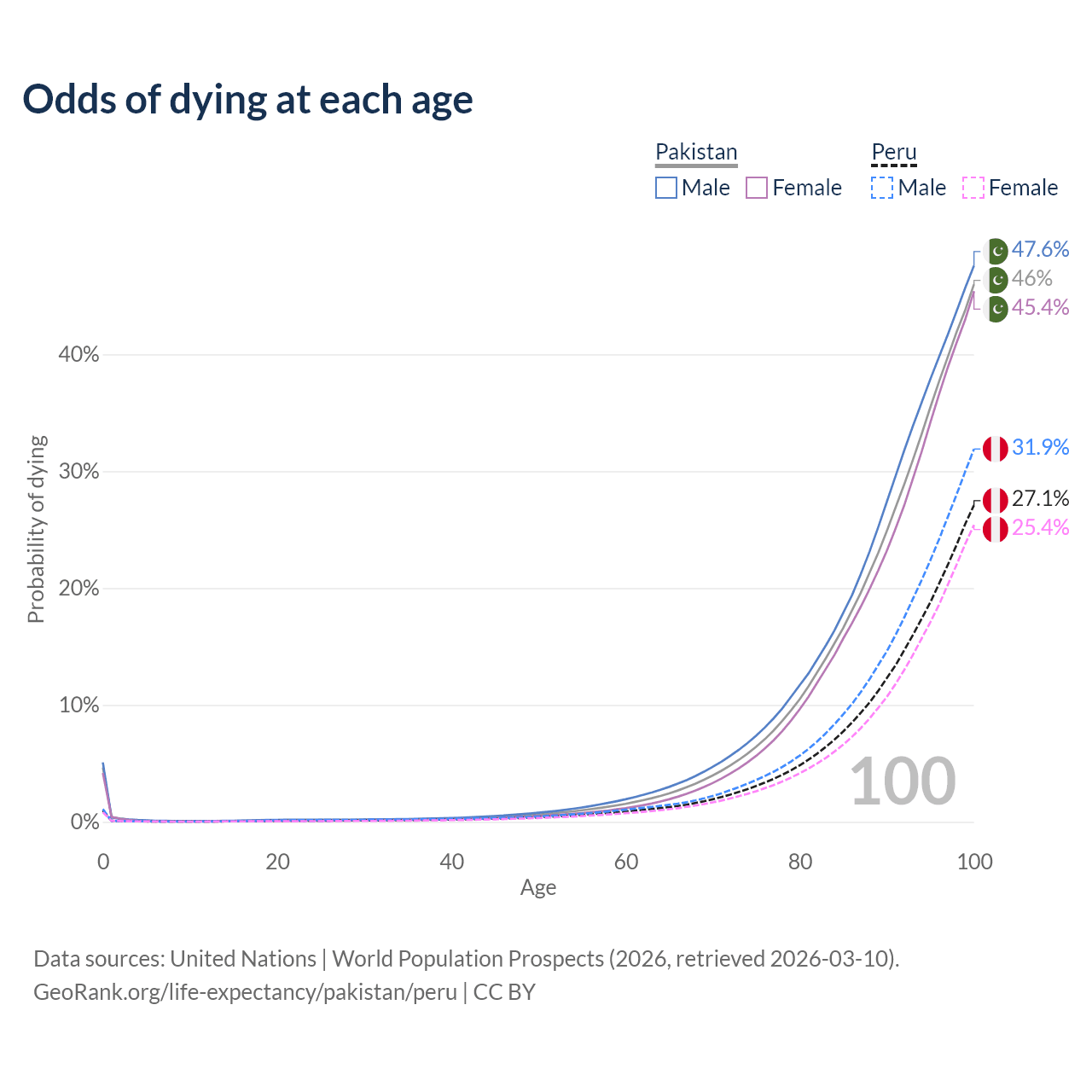 This life expectancy calculator shows the odds of living to 100, 95, 90, and below based on current age for both males and females in Pakistan and Peru, along with mean and median age of death. The calculations are based on the 2026 life tables (actuarial tables) from the UN World Population Prospects.