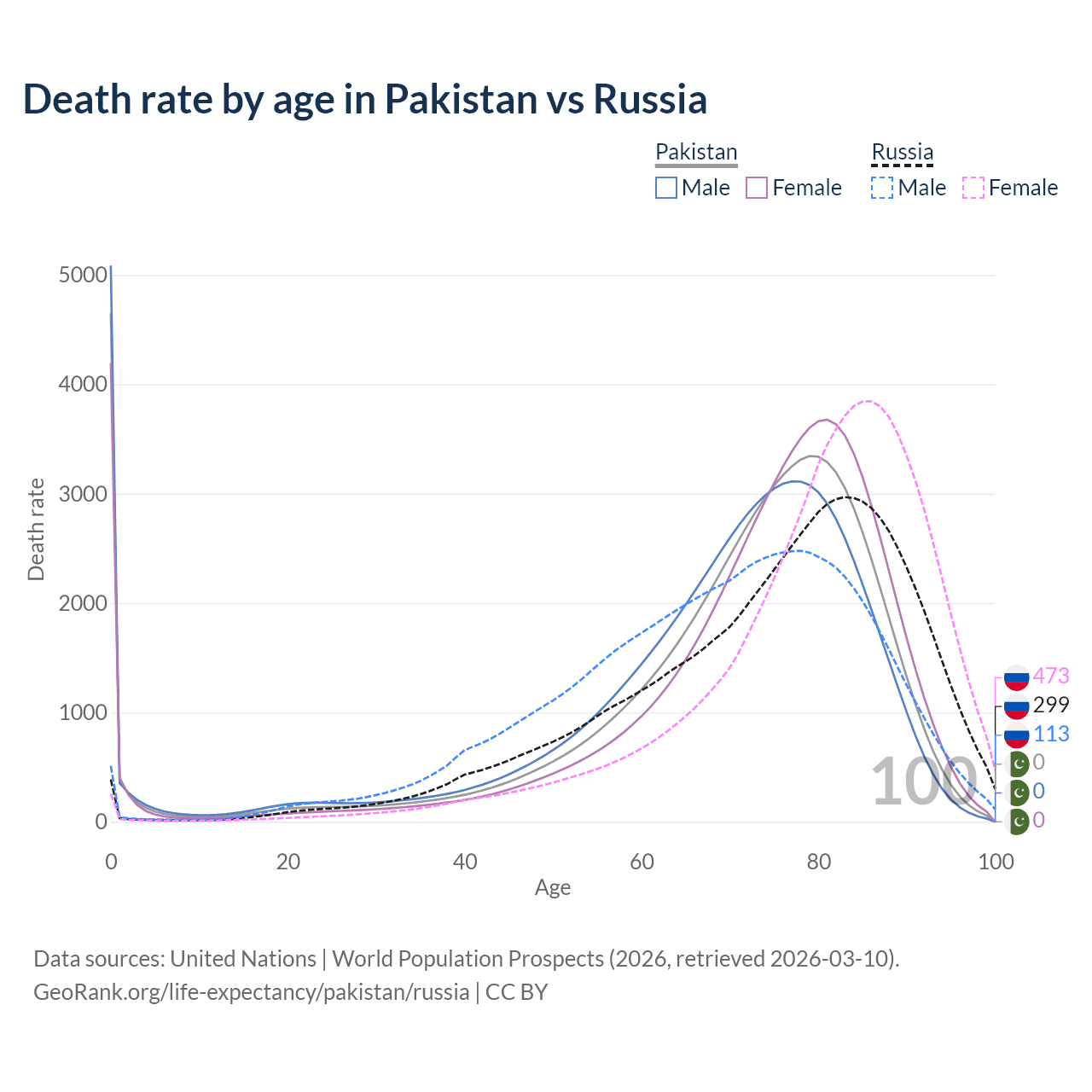 In Pakistan, the most common age of death is 0, compared to 83 in Russia. The median age of death is 74.3 in Pakistan and 77.5 in Russia, meaning only half of each cohort is expected to live past that age.