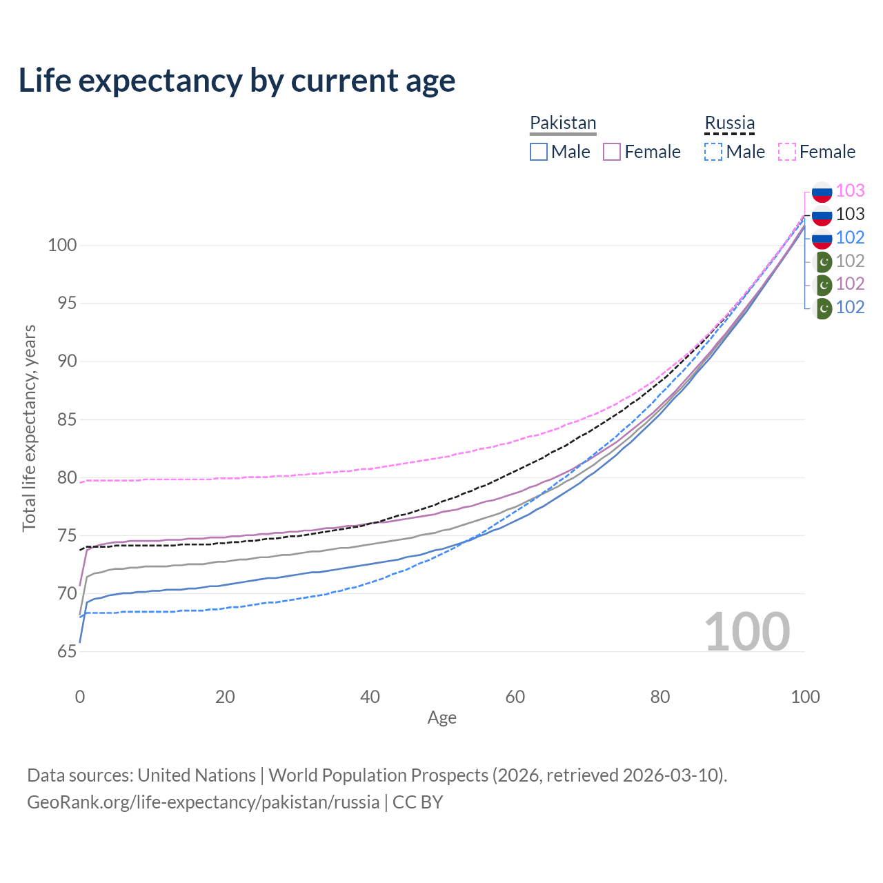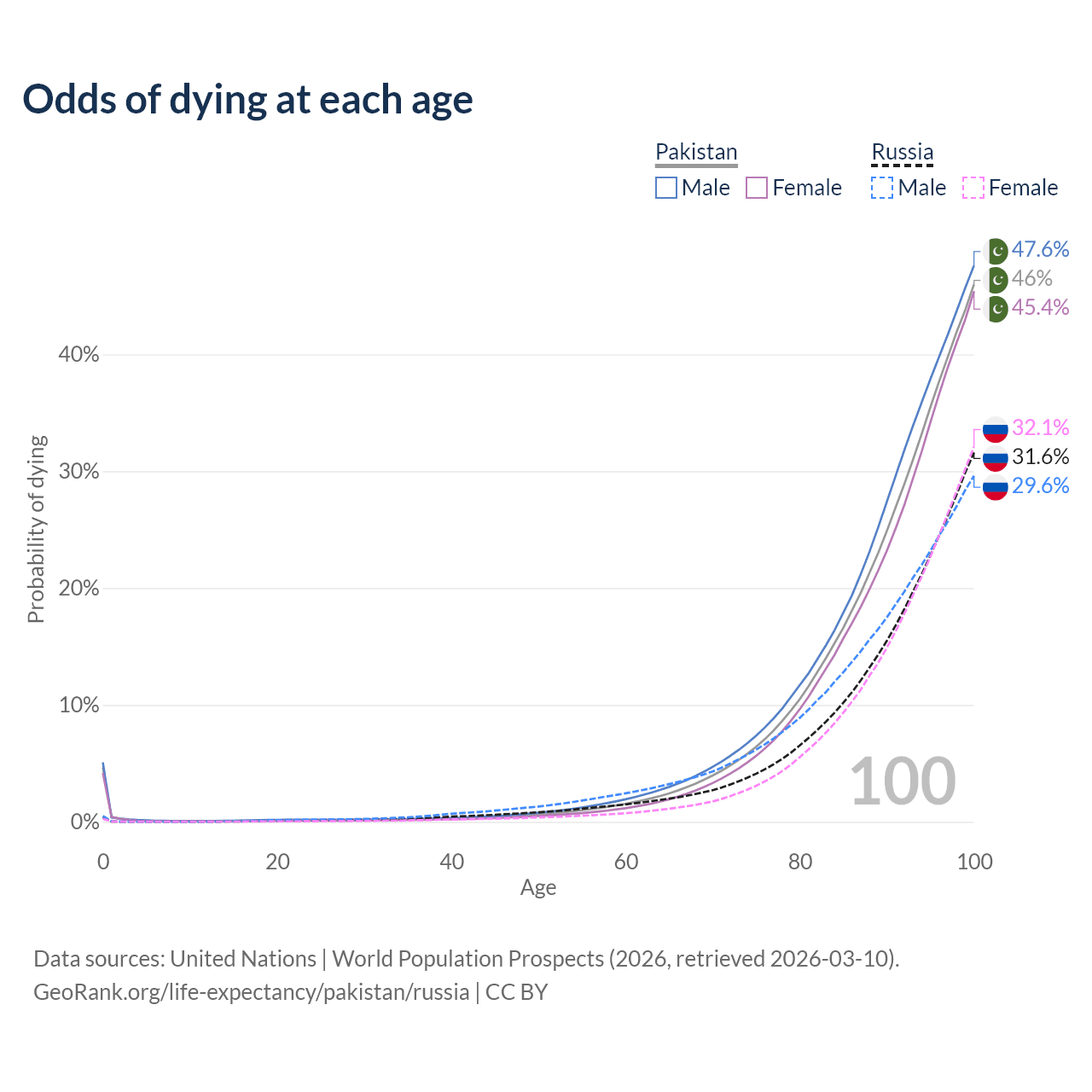 This life expectancy calculator shows the odds of living to 100, 95, 90, and below based on current age for both males and females in Pakistan and Russia, along with mean and median age of death. The calculations are based on the 2026 life tables (actuarial tables) from the UN World Population Prospects.