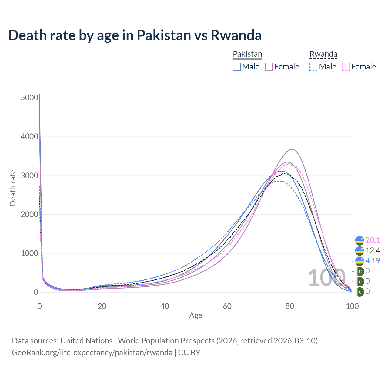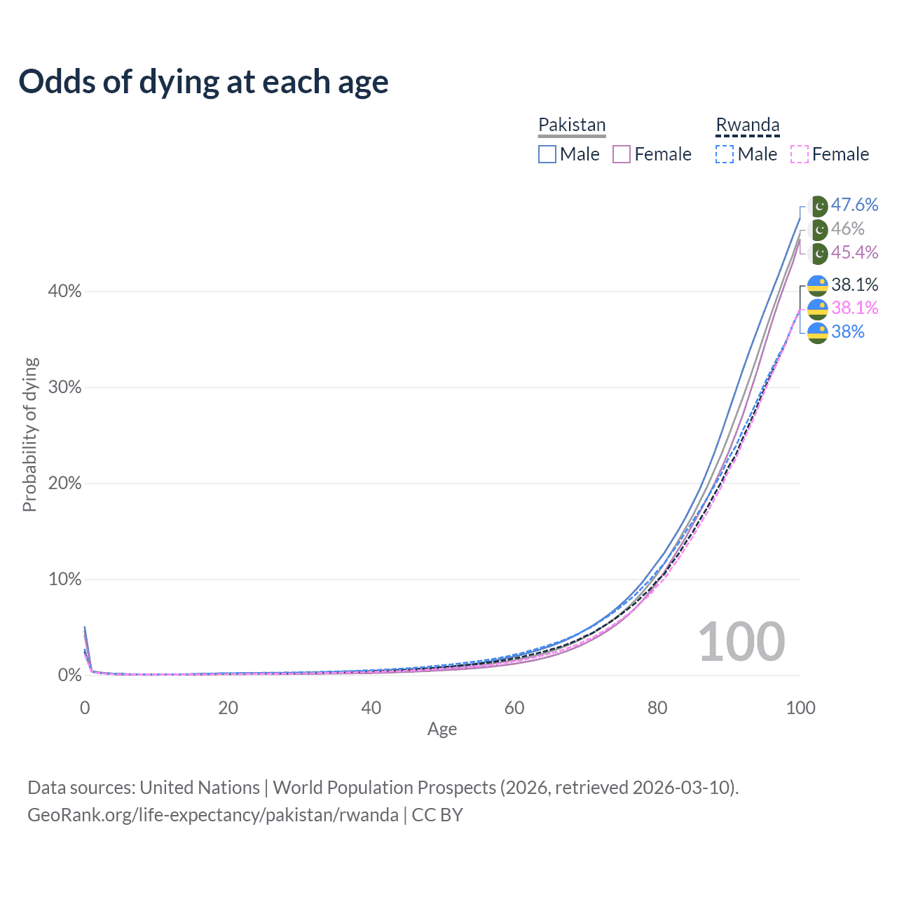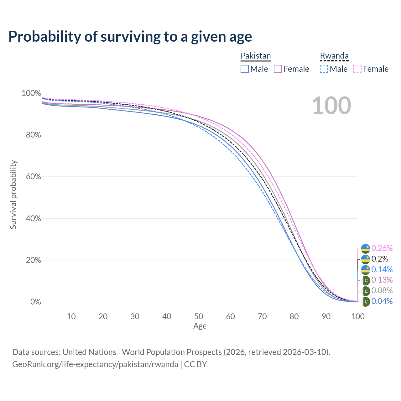 This life expectancy calculator shows the odds of living to 100, 95, 90, and below based on current age for both males and females in Pakistan and Rwanda, along with mean and median age of death. The calculations are based on the 2026 life tables (actuarial tables) from the UN World Population Prospects.