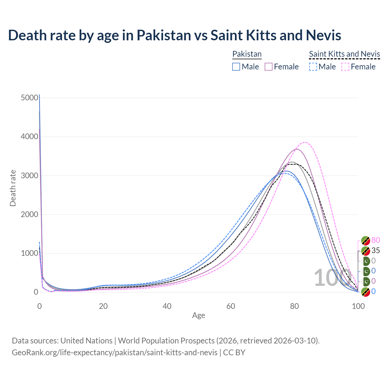In Pakistan, the most common age of death is 0, compared to 80 in Saint Kitts and Nevis. The median age of death is 74.3 in Pakistan and 76.3 in Saint Kitts and Nevis, meaning only half of each cohort is expected to live past that age.
