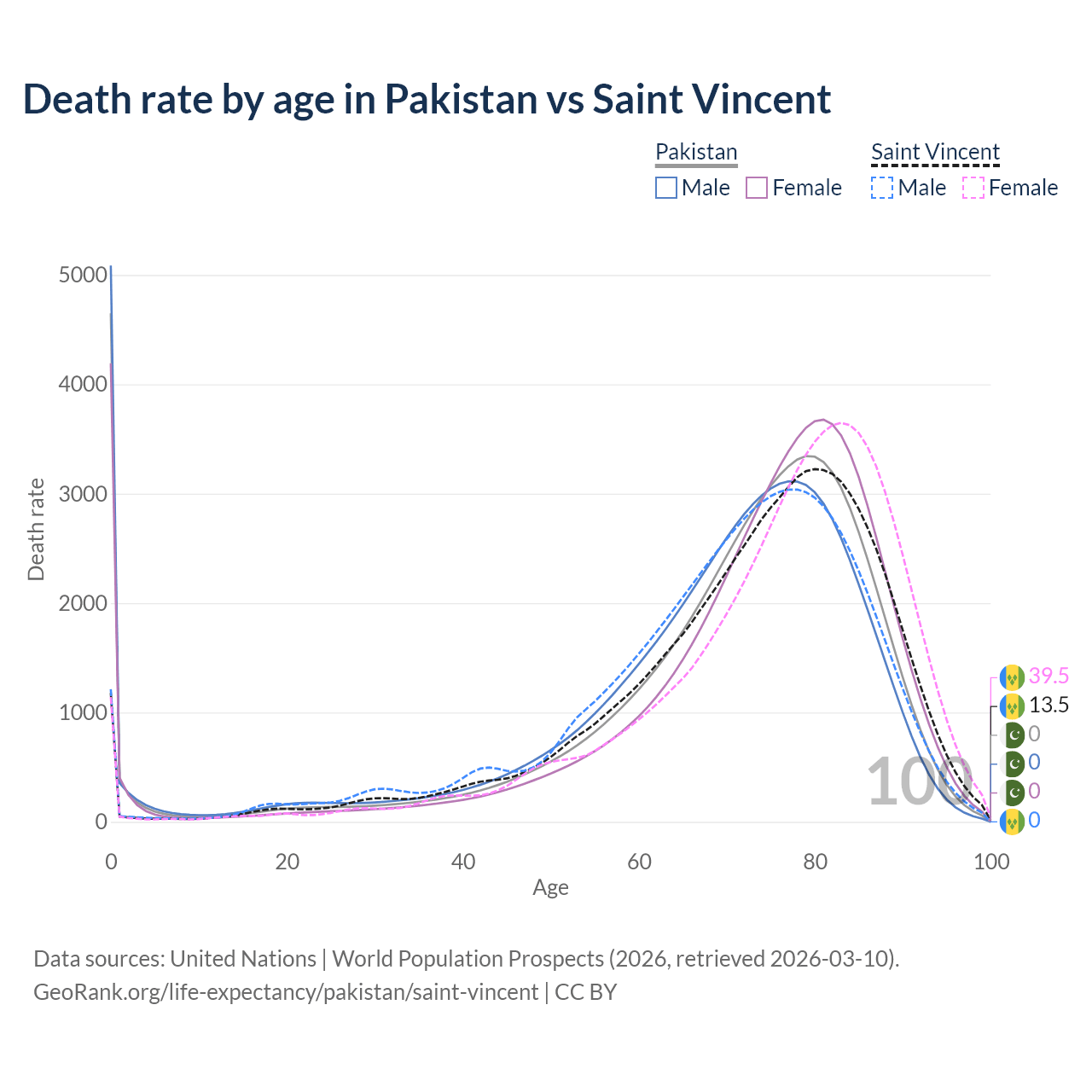 In Pakistan, the most common age of death is 0, compared to 80 in Saint Vincent. The median age of death is 74.3 in Pakistan and 75.6 in Saint Vincent, meaning only half of each cohort is expected to live past that age.