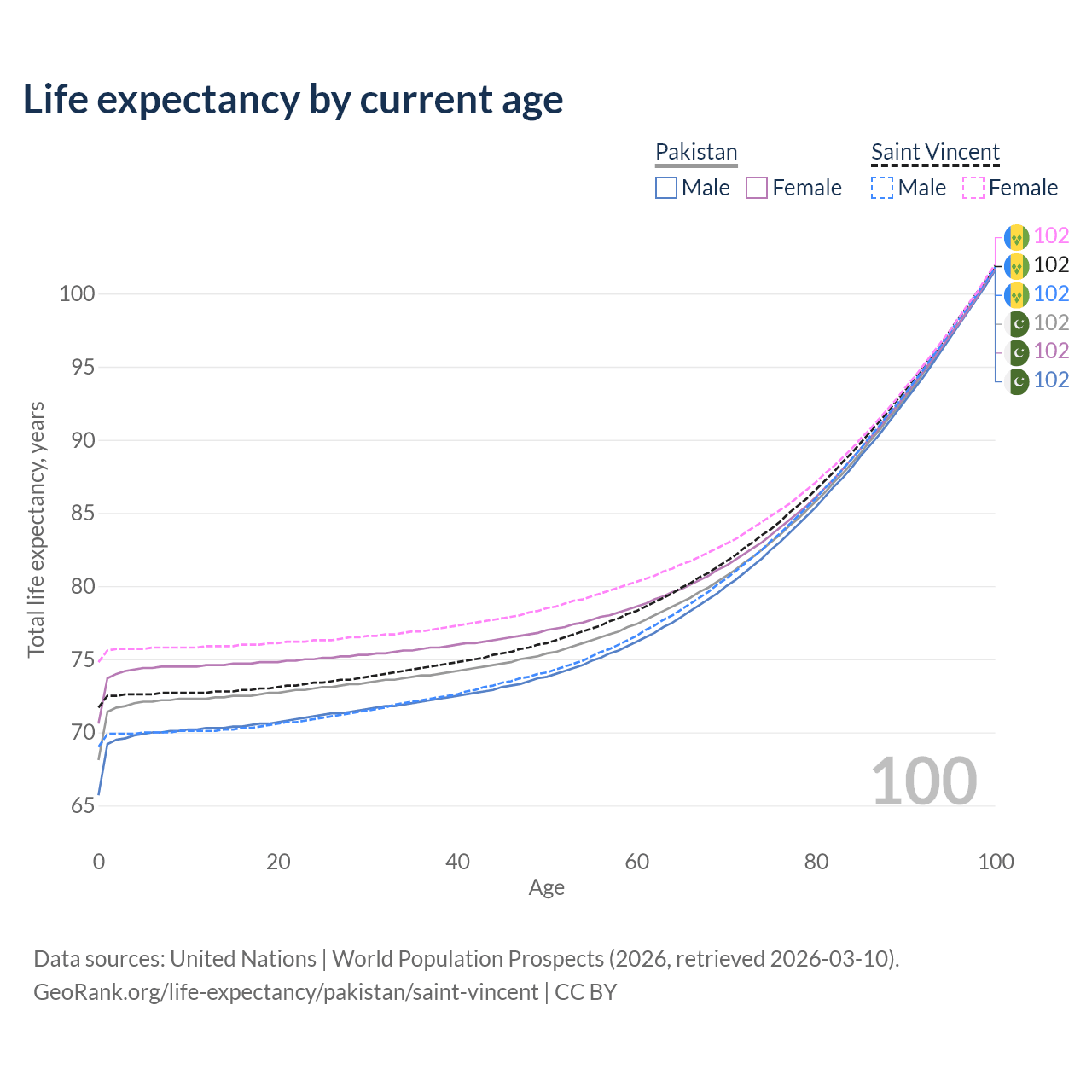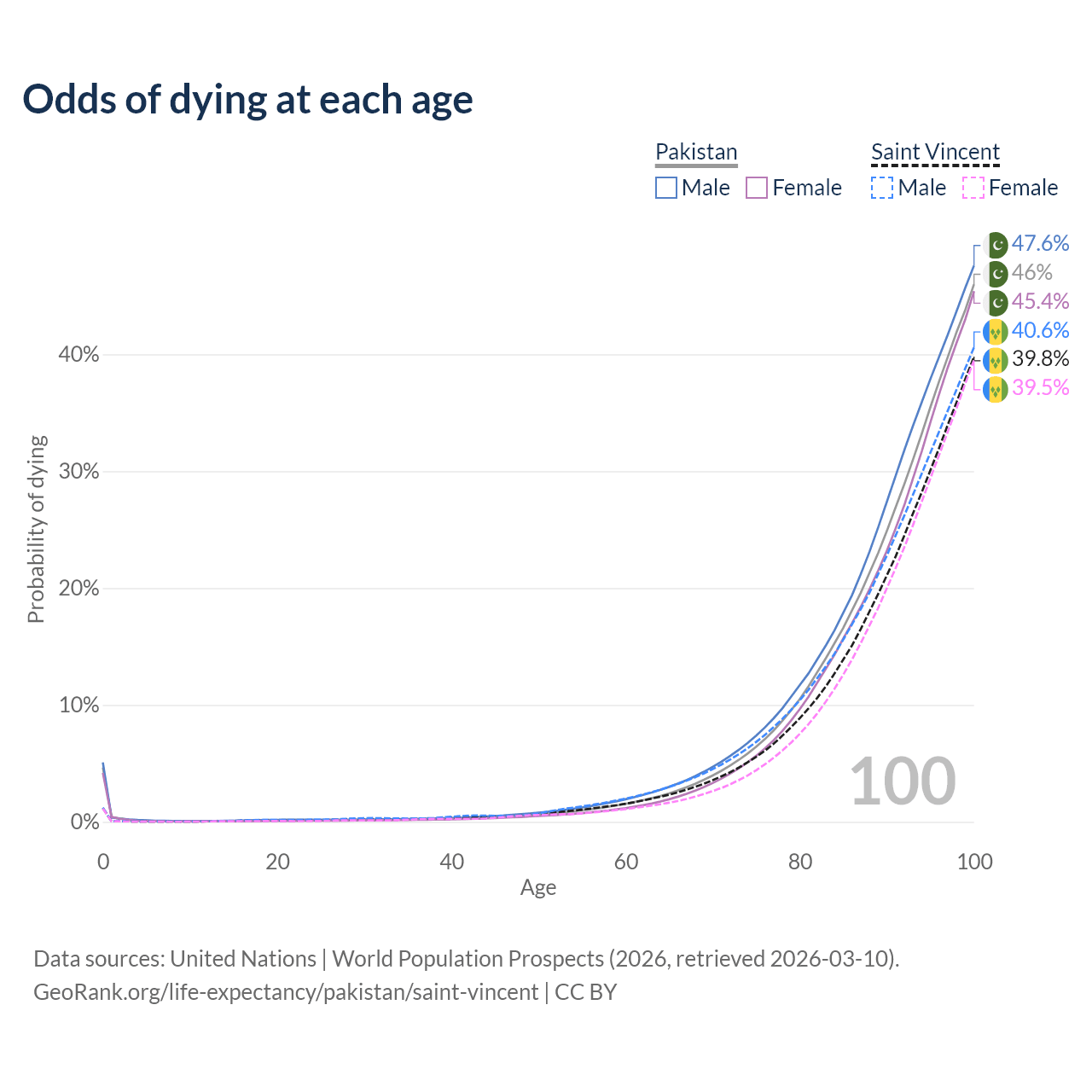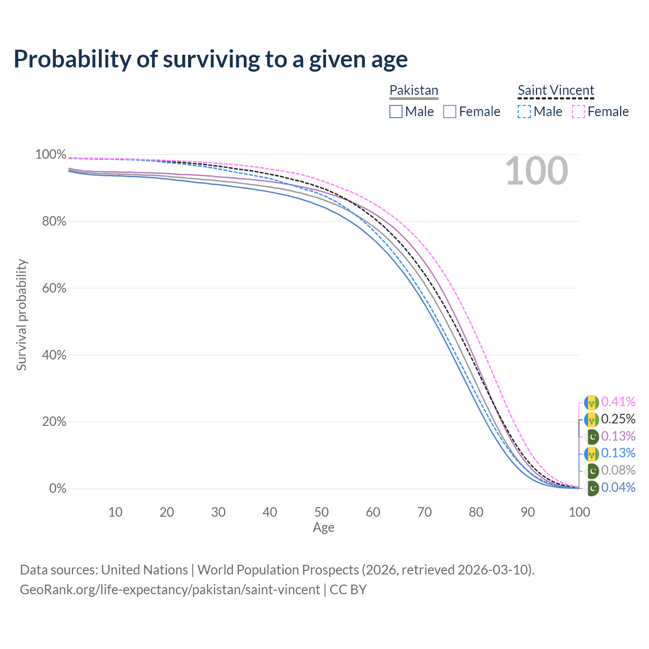 This life expectancy calculator shows the odds of living to 100, 95, 90, and below based on current age for both males and females in Pakistan and Saint Vincent, along with mean and median age of death. The calculations are based on the 2026 life tables (actuarial tables) from the UN World Population Prospects.