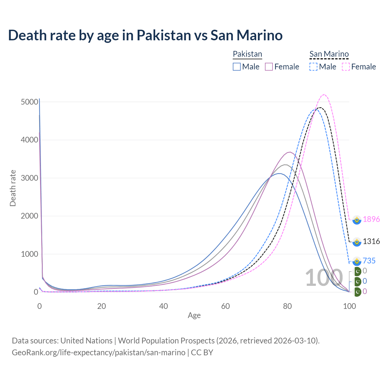 In Pakistan, the most common age of death is 0, compared to 91 in San Marino. The median age of death is 74.3 in Pakistan and 88.3 in San Marino, meaning only half of each cohort is expected to live past that age.
