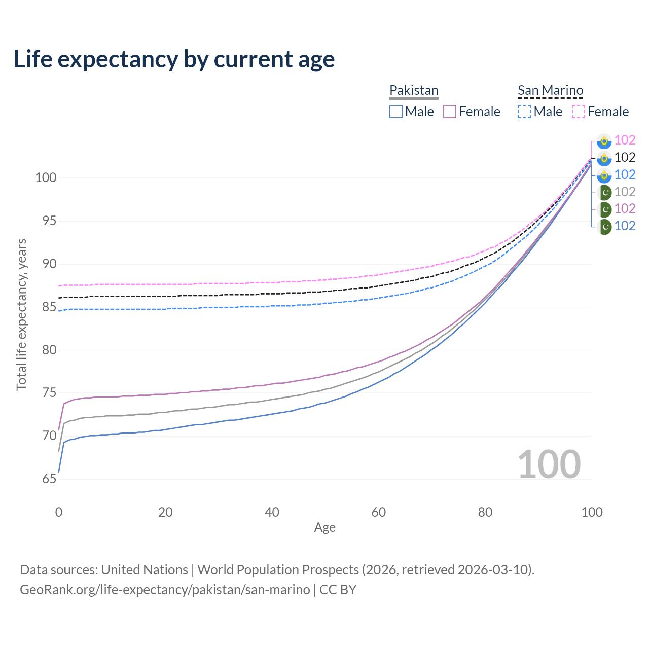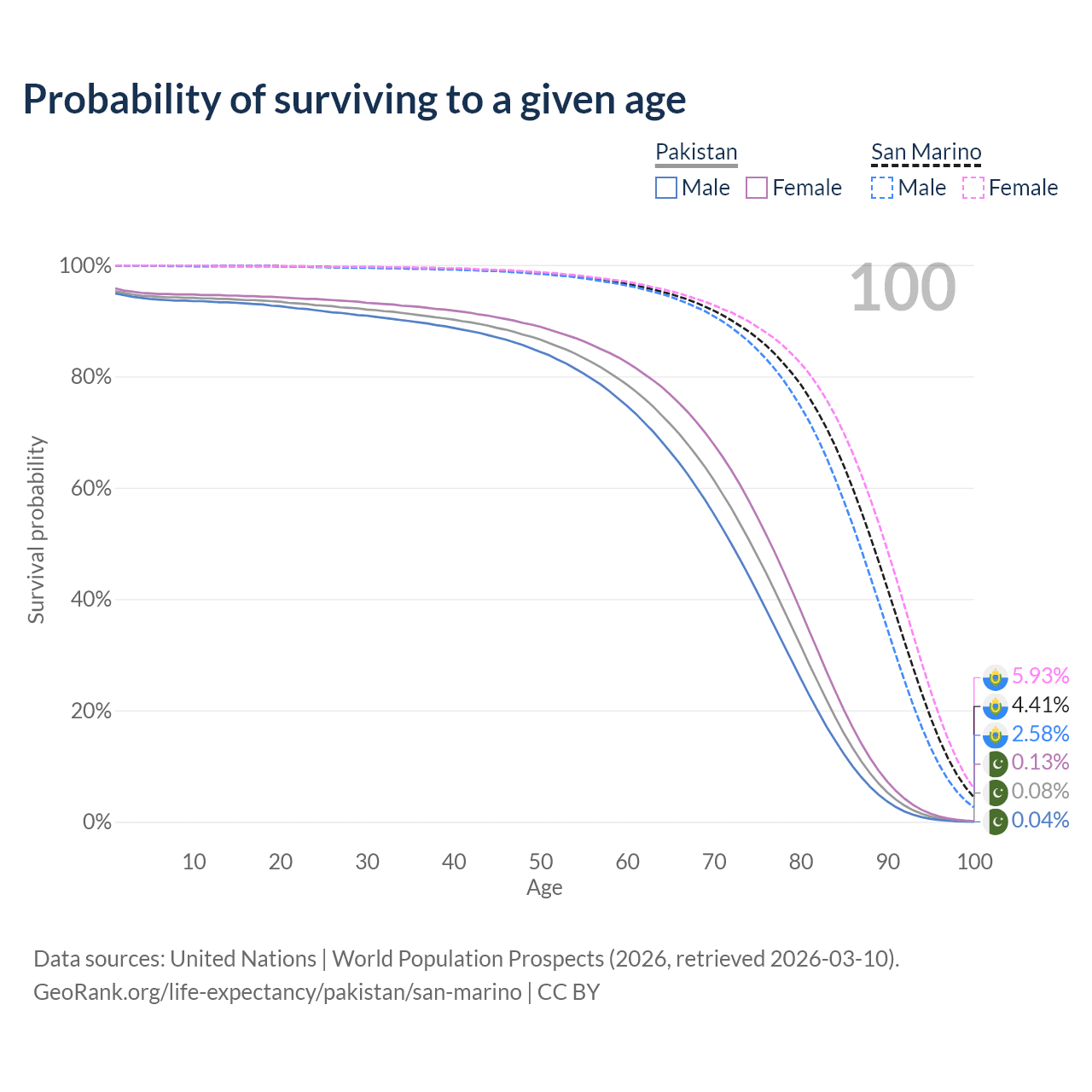 This life expectancy calculator shows the odds of living to 100, 95, 90, and below based on current age for both males and females in Pakistan and San Marino, along with mean and median age of death. The calculations are based on the 2026 life tables (actuarial tables) from the UN World Population Prospects.