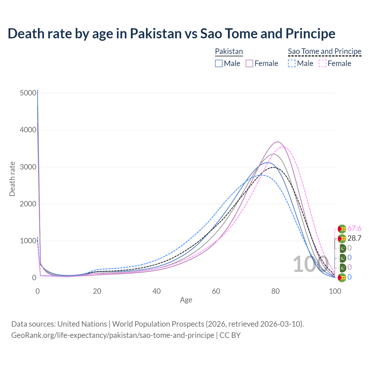 In Pakistan, the most common age of death is 0, compared to 79 in Sao Tome and Principe. The median age of death is 74.3 in Pakistan and 74.1 in Sao Tome and Principe, meaning only half of each cohort is expected to live past that age.