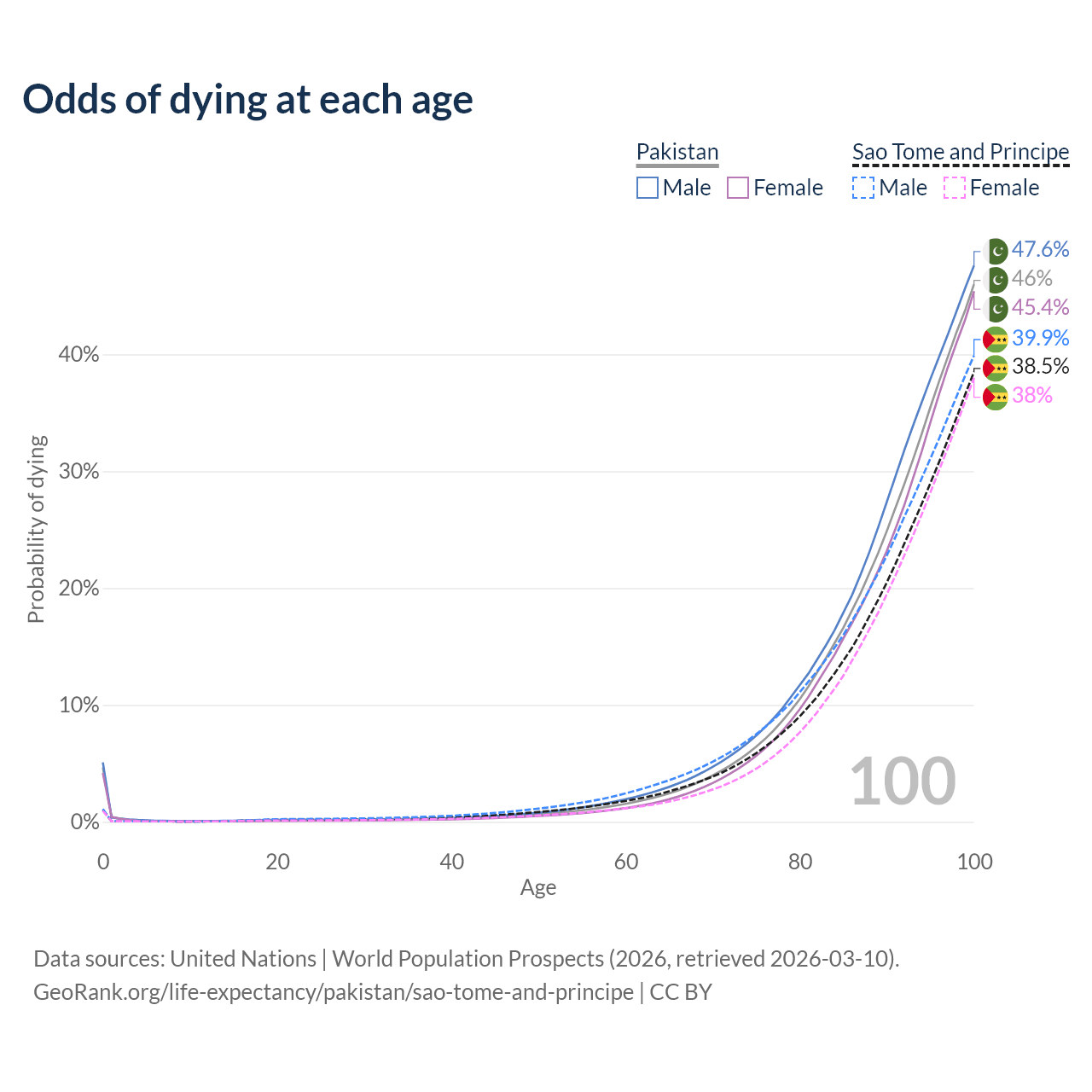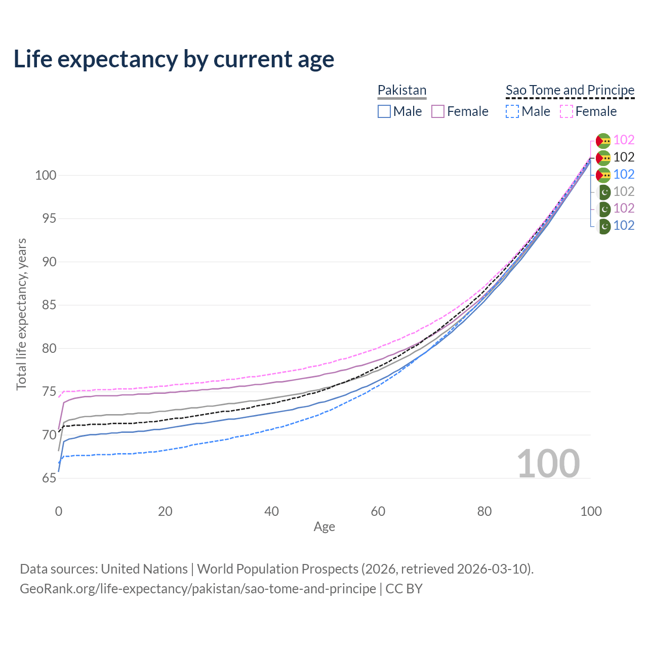 This life expectancy calculator shows the odds of living to 100, 95, 90, and below based on current age for both males and females in Pakistan and Sao Tome and Principe, along with mean and median age of death. The calculations are based on the 2026 life tables (actuarial tables) from the UN World Population Prospects.