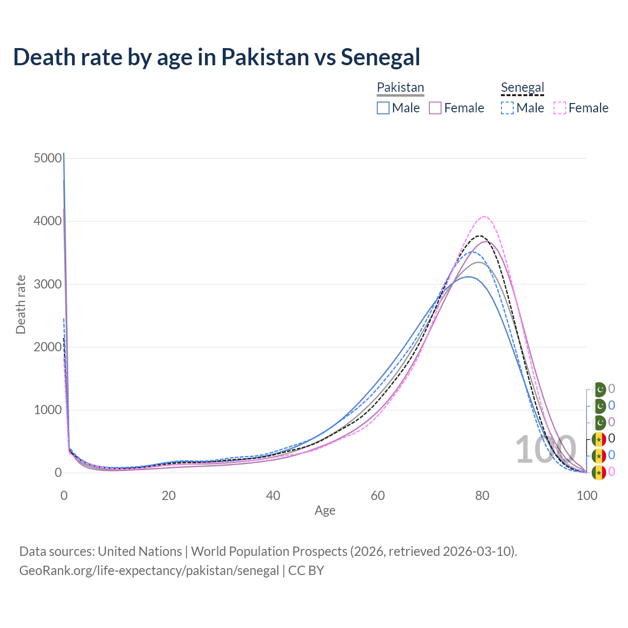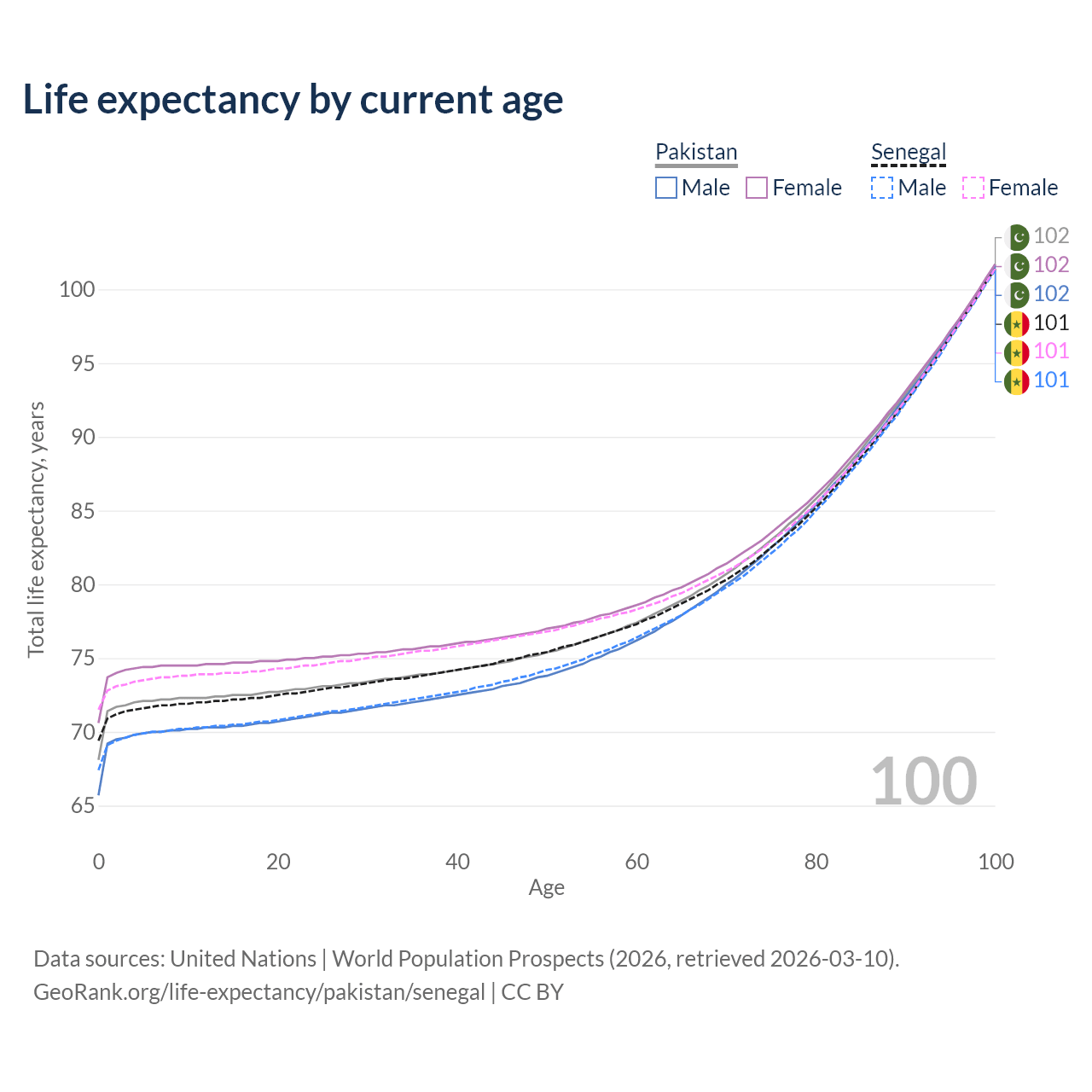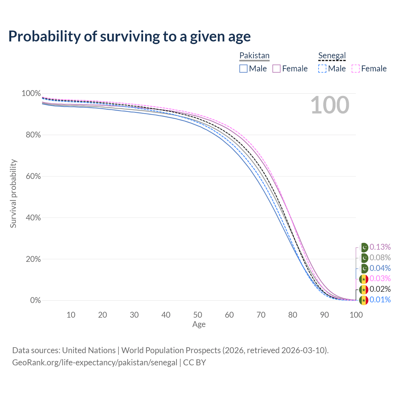 This life expectancy calculator shows the odds of living to 100, 95, 90, and below based on current age for both males and females in Pakistan and Senegal, along with mean and median age of death. The calculations are based on the 2026 life tables (actuarial tables) from the UN World Population Prospects.