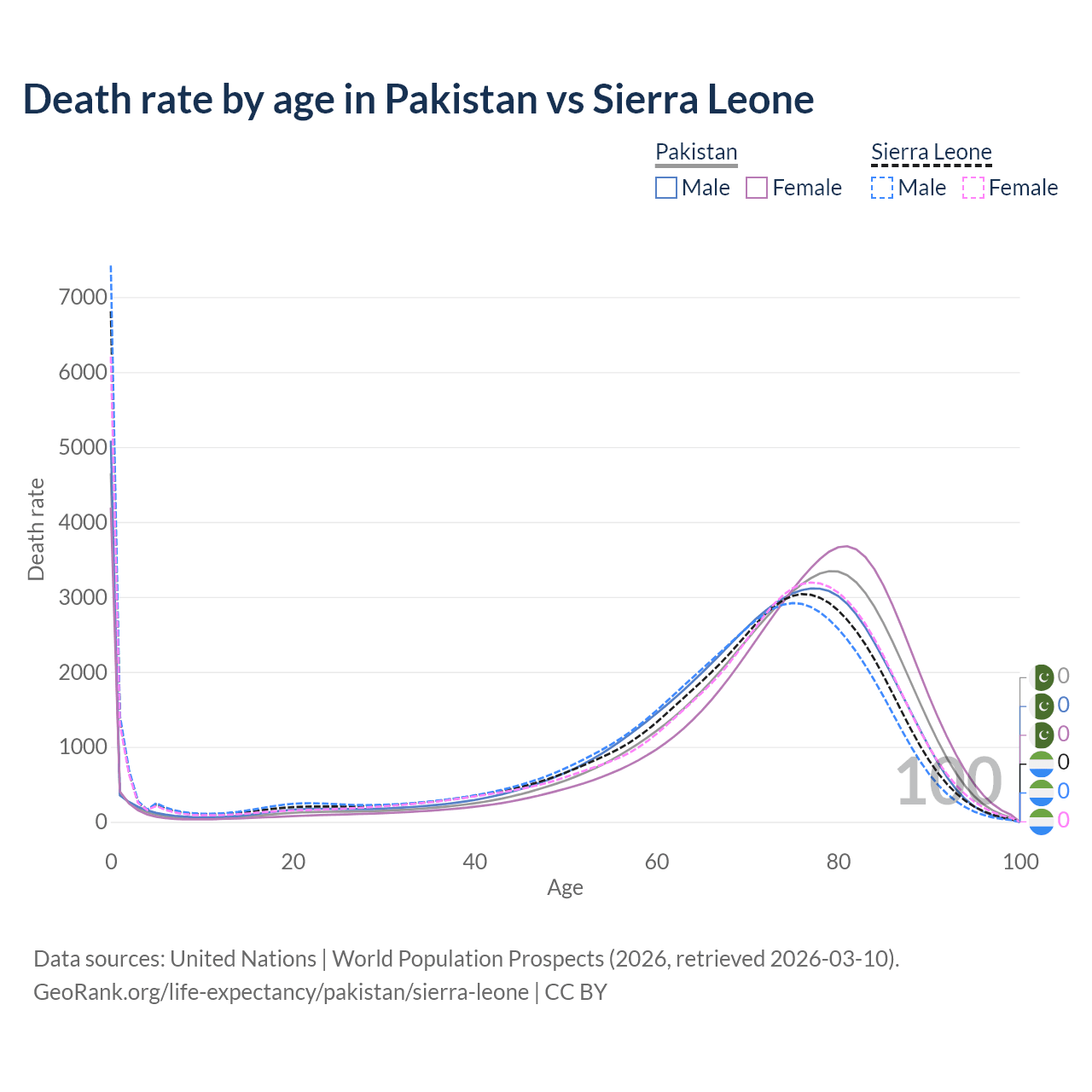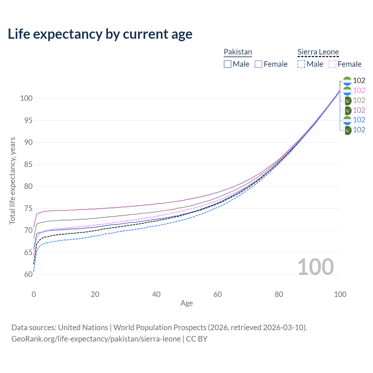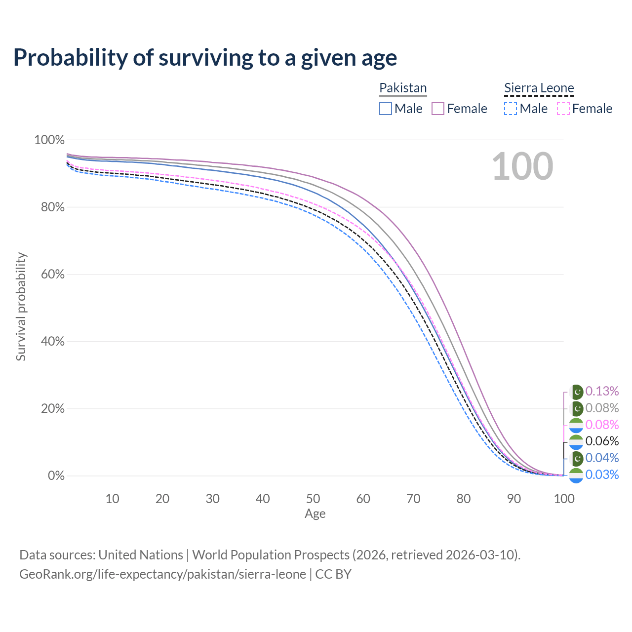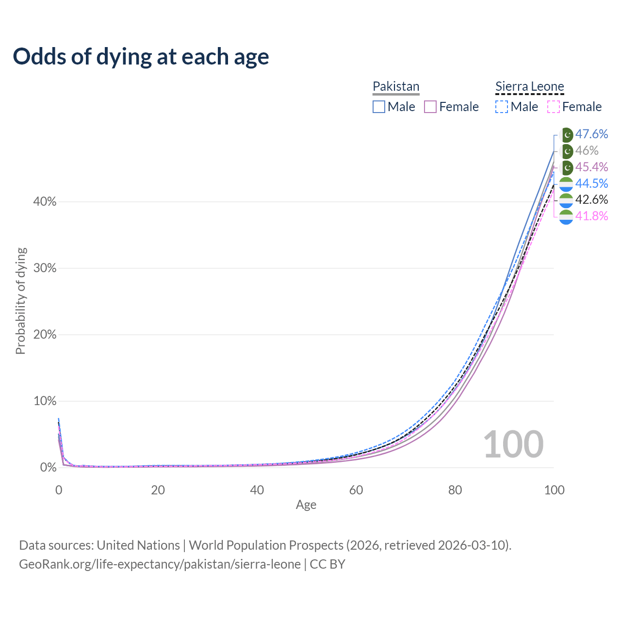 This life expectancy calculator shows the odds of living to 100, 95, 90, and below based on current age for both males and females in Pakistan and Sierra Leone, along with mean and median age of death. The calculations are based on the 2026 life tables (actuarial tables) from the UN World Population Prospects.