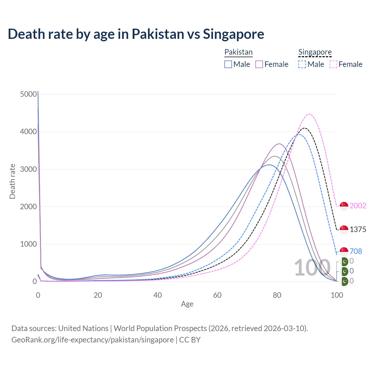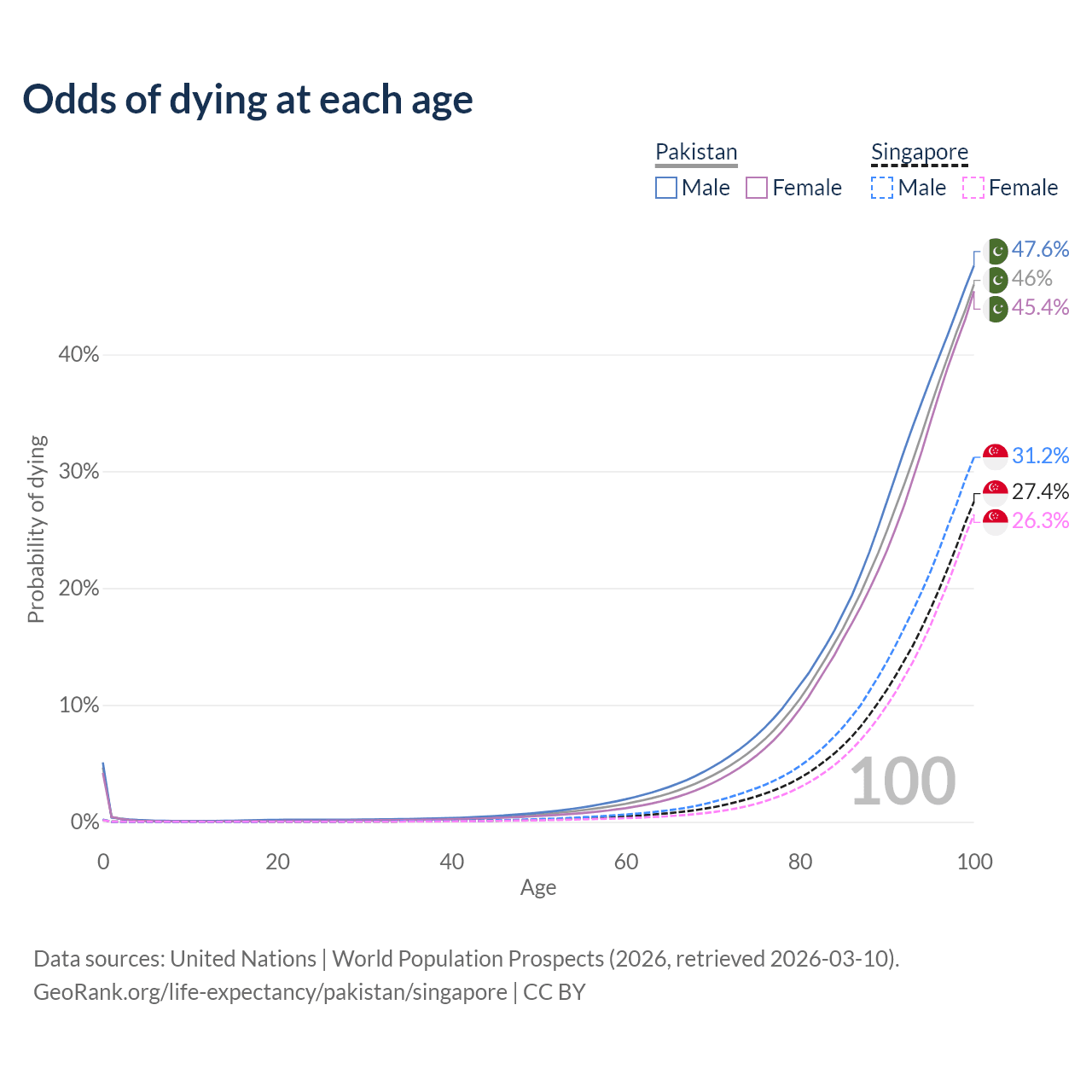 This life expectancy calculator shows the odds of living to 100, 95, 90, and below based on current age for both males and females in Pakistan and Singapore, along with mean and median age of death. The calculations are based on the 2026 life tables (actuarial tables) from the UN World Population Prospects.
