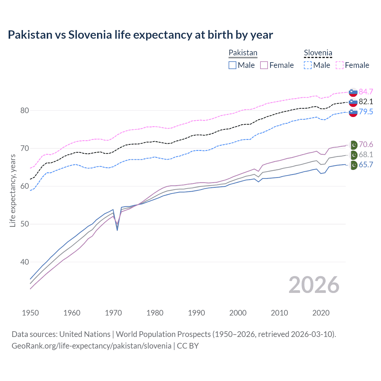 The average life expectancy at birth is 68.1 years in Pakistan vs 82.1 in Slovenia. Pakistan is ranked 151/197 by life expectancy, and Slovenia is 33/197. In Pakistan, the life expectancy is 65.7 years for males and 70.6 years for females. In Slovenia, it's 79.5 years for males and 84.7 years for females.