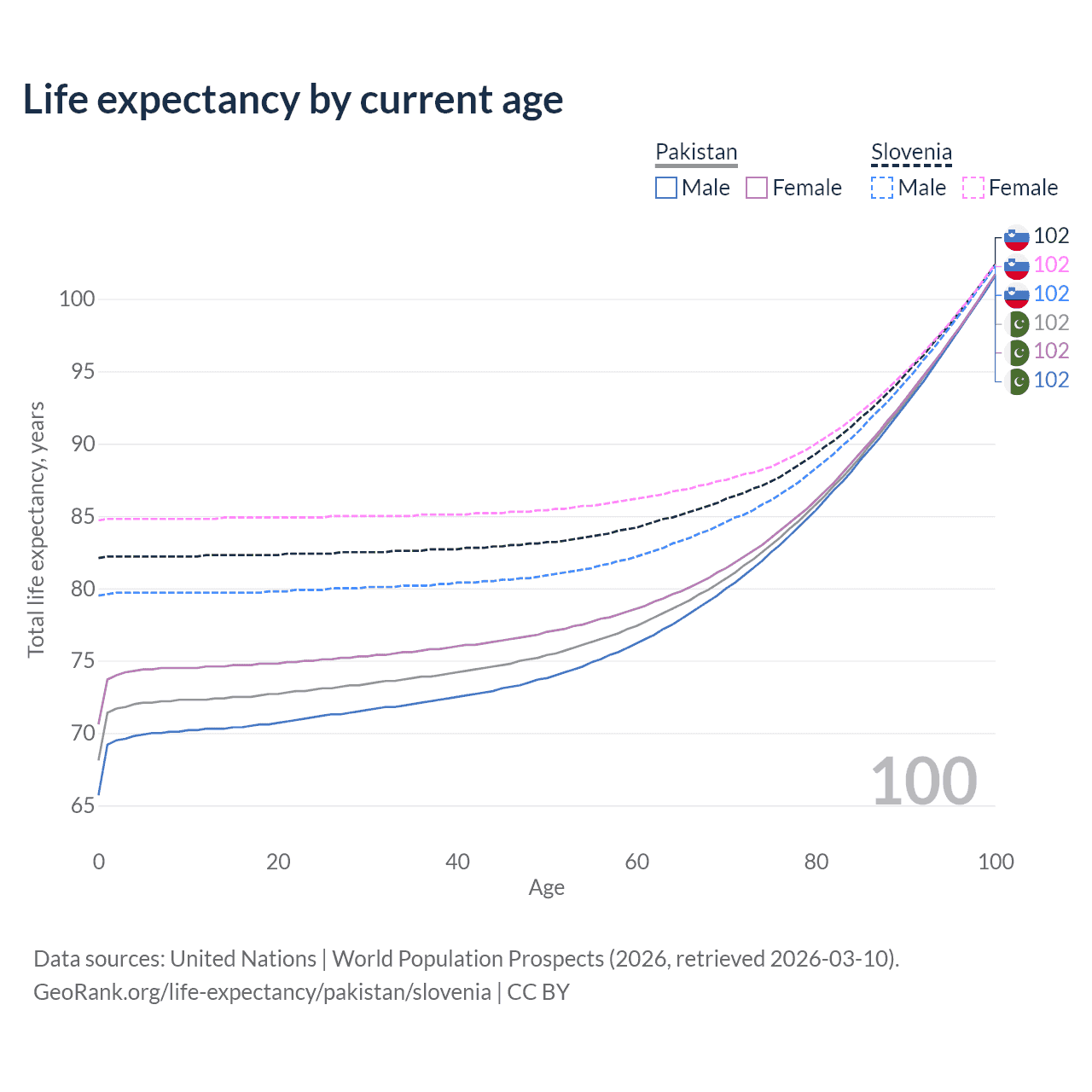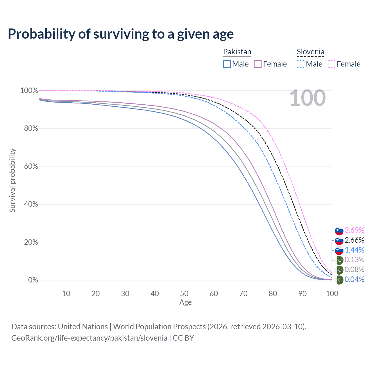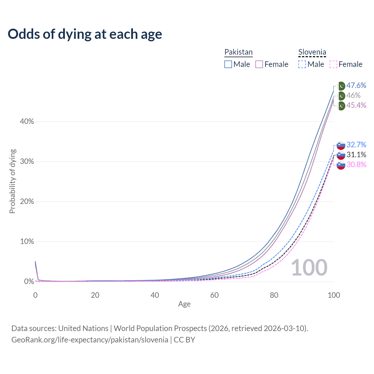 This life expectancy calculator shows the odds of living to 100, 95, 90, and below based on current age for both males and females in Pakistan and Slovenia, along with mean and median age of death. The calculations are based on the 2026 life tables (actuarial tables) from the UN World Population Prospects.