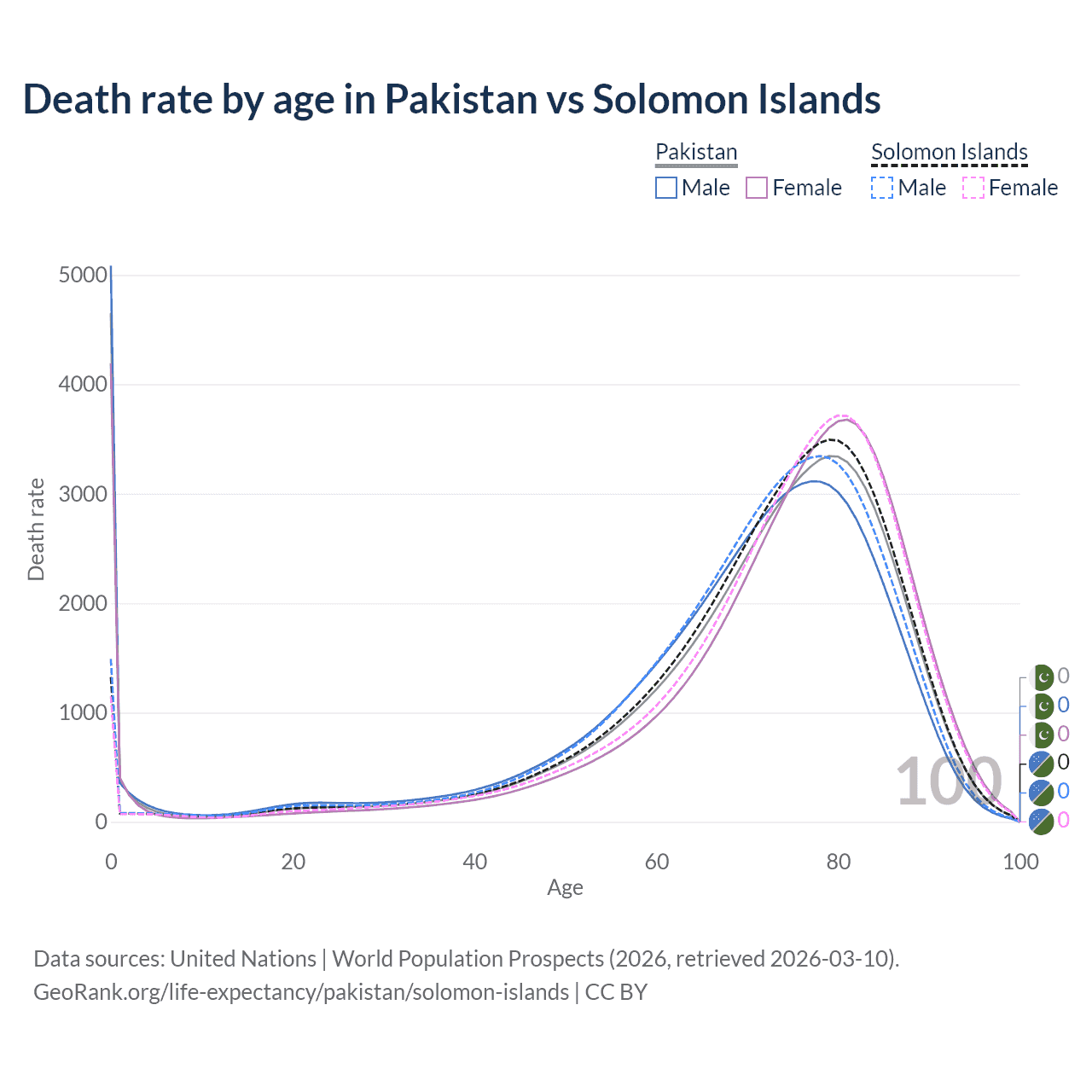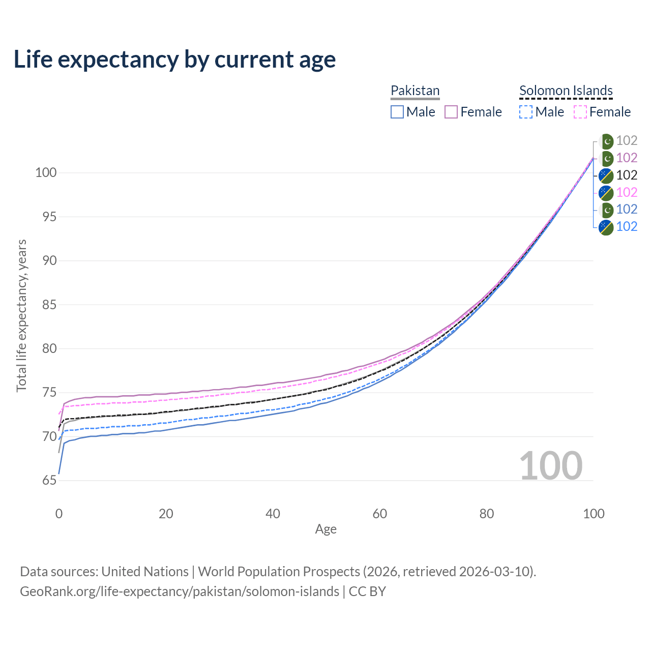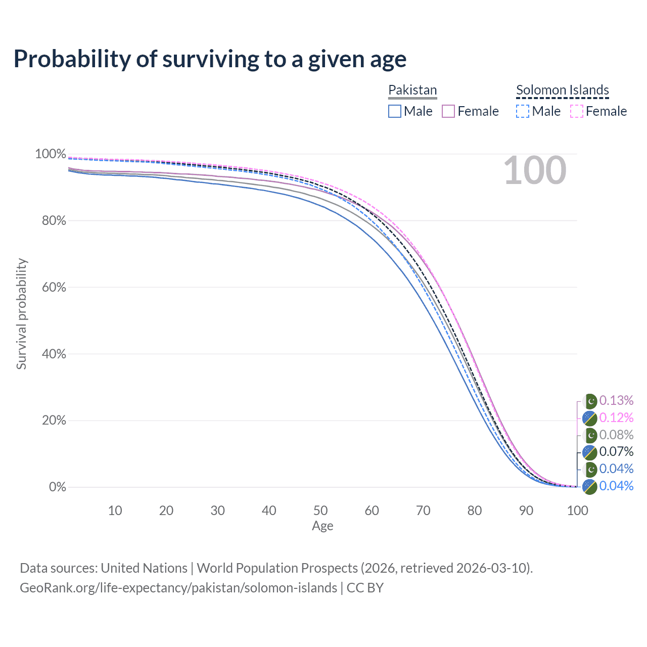 This life expectancy calculator shows the odds of living to 100, 95, 90, and below based on current age for both males and females in Pakistan and the Solomon Islands, along with mean and median age of death. The calculations are based on the 2026 life tables (actuarial tables) from the UN World Population Prospects.