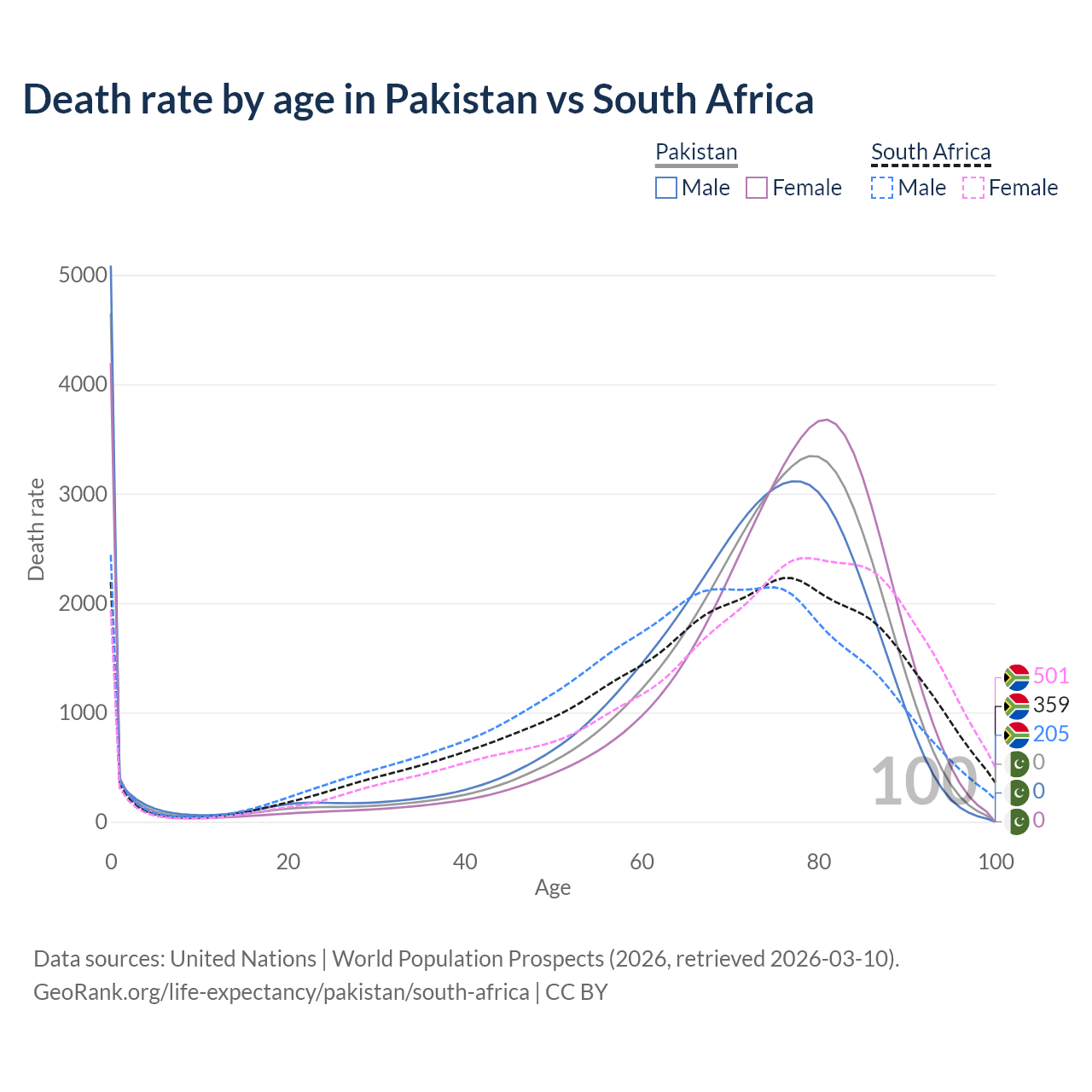 In Pakistan, the most common age of death is 0, compared to 77 in South Africa. The median age of death is 74.3 in Pakistan and 70.8 in South Africa, meaning only half of each cohort is expected to live past that age.