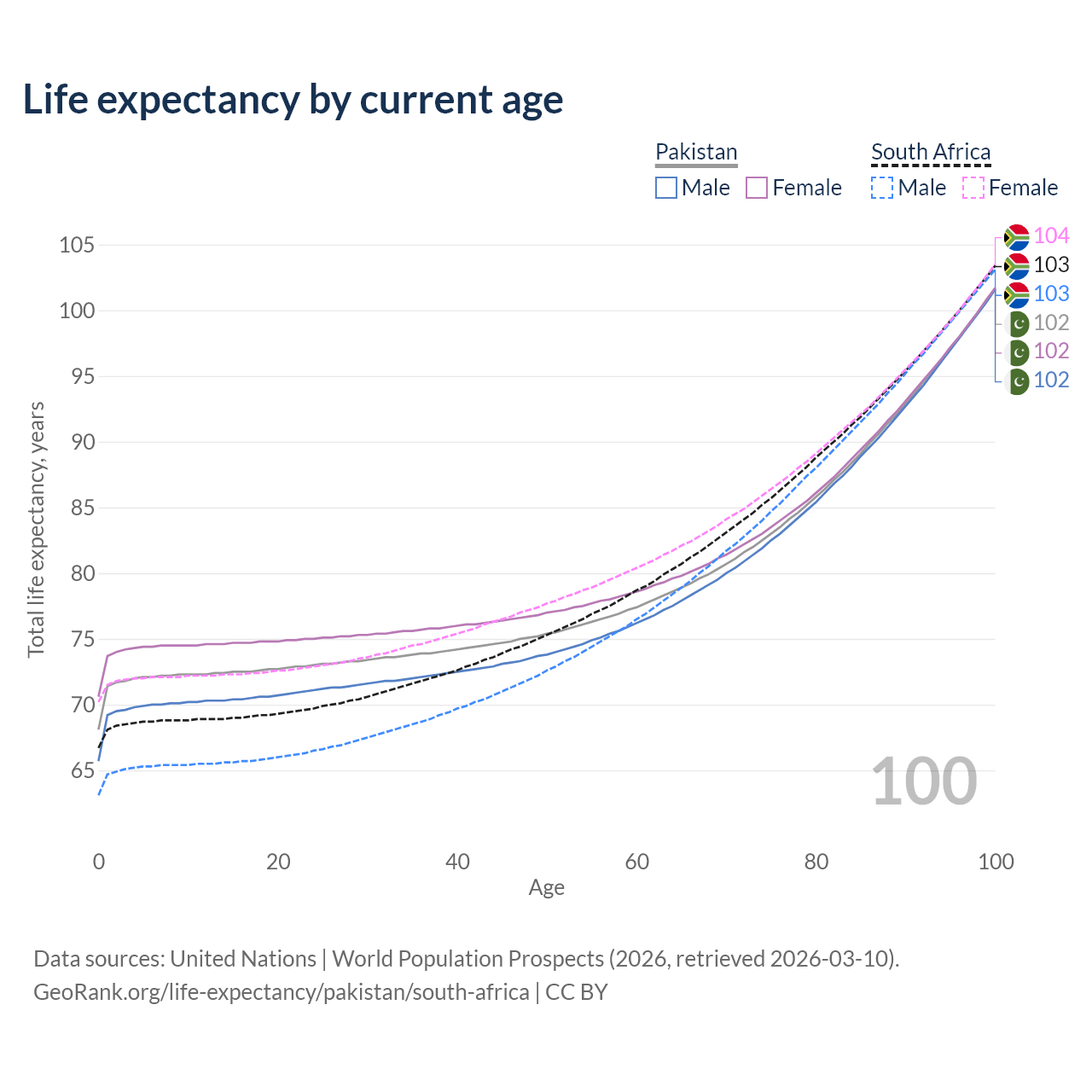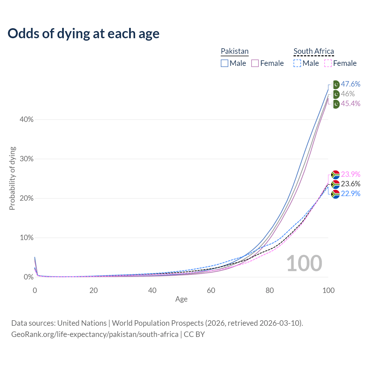 This life expectancy calculator shows the odds of living to 100, 95, 90, and below based on current age for both males and females in Pakistan and South Africa, along with mean and median age of death. The calculations are based on the 2026 life tables (actuarial tables) from the UN World Population Prospects.