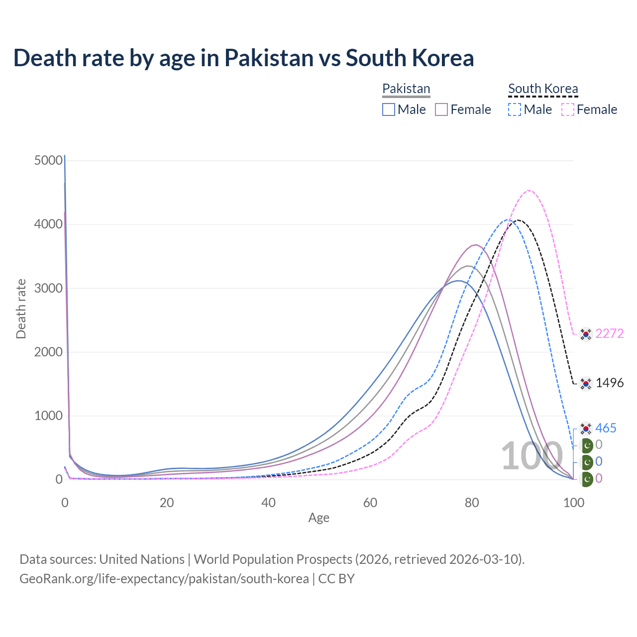 In Pakistan, the most common age of death is 0, compared to 89 in South Korea. The median age of death is 74.3 in Pakistan and 86.8 in South Korea, meaning only half of each cohort is expected to live past that age.