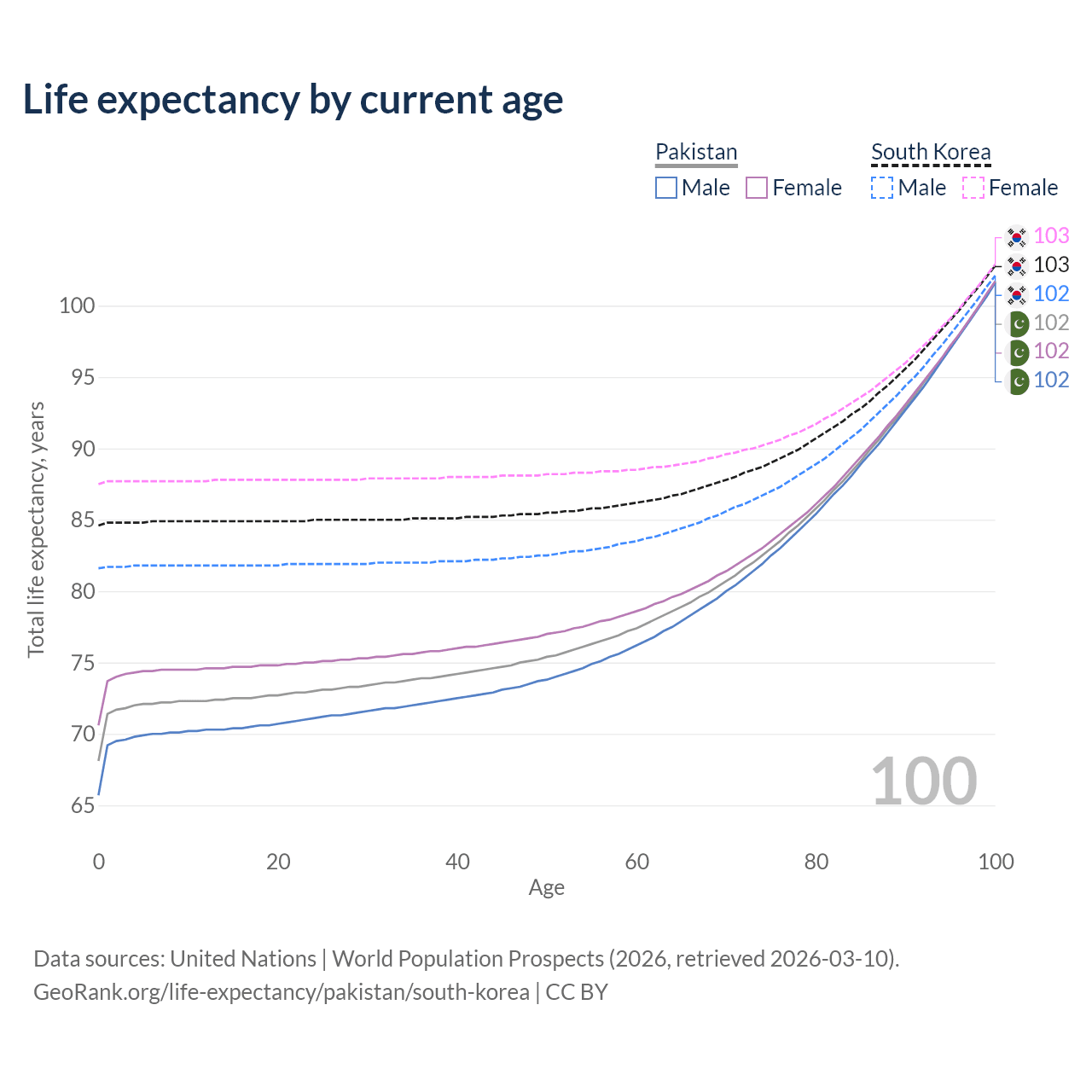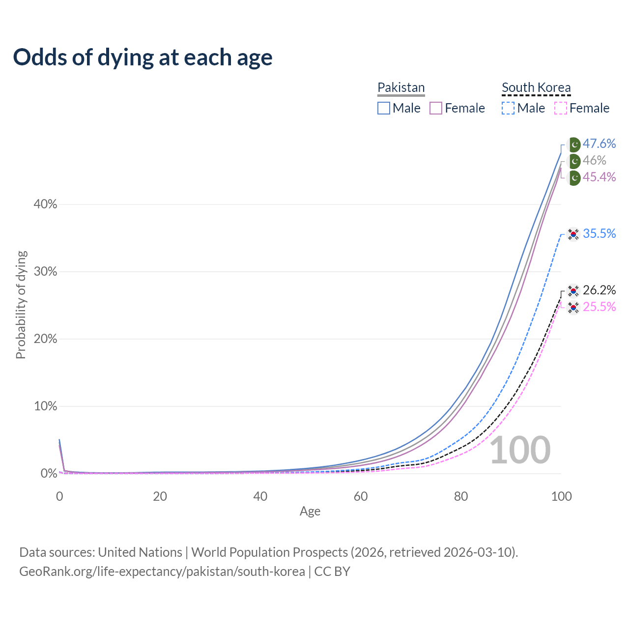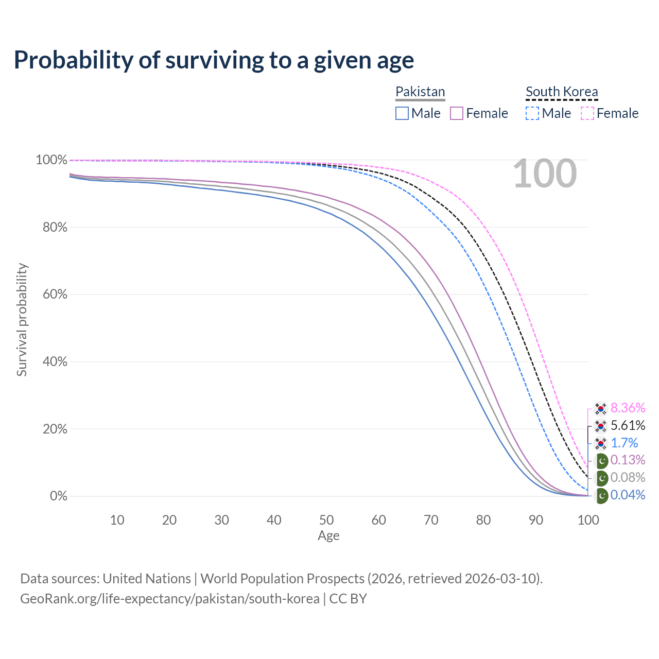 This life expectancy calculator shows the odds of living to 100, 95, 90, and below based on current age for both males and females in Pakistan and South Korea, along with mean and median age of death. The calculations are based on the 2026 life tables (actuarial tables) from the UN World Population Prospects.
