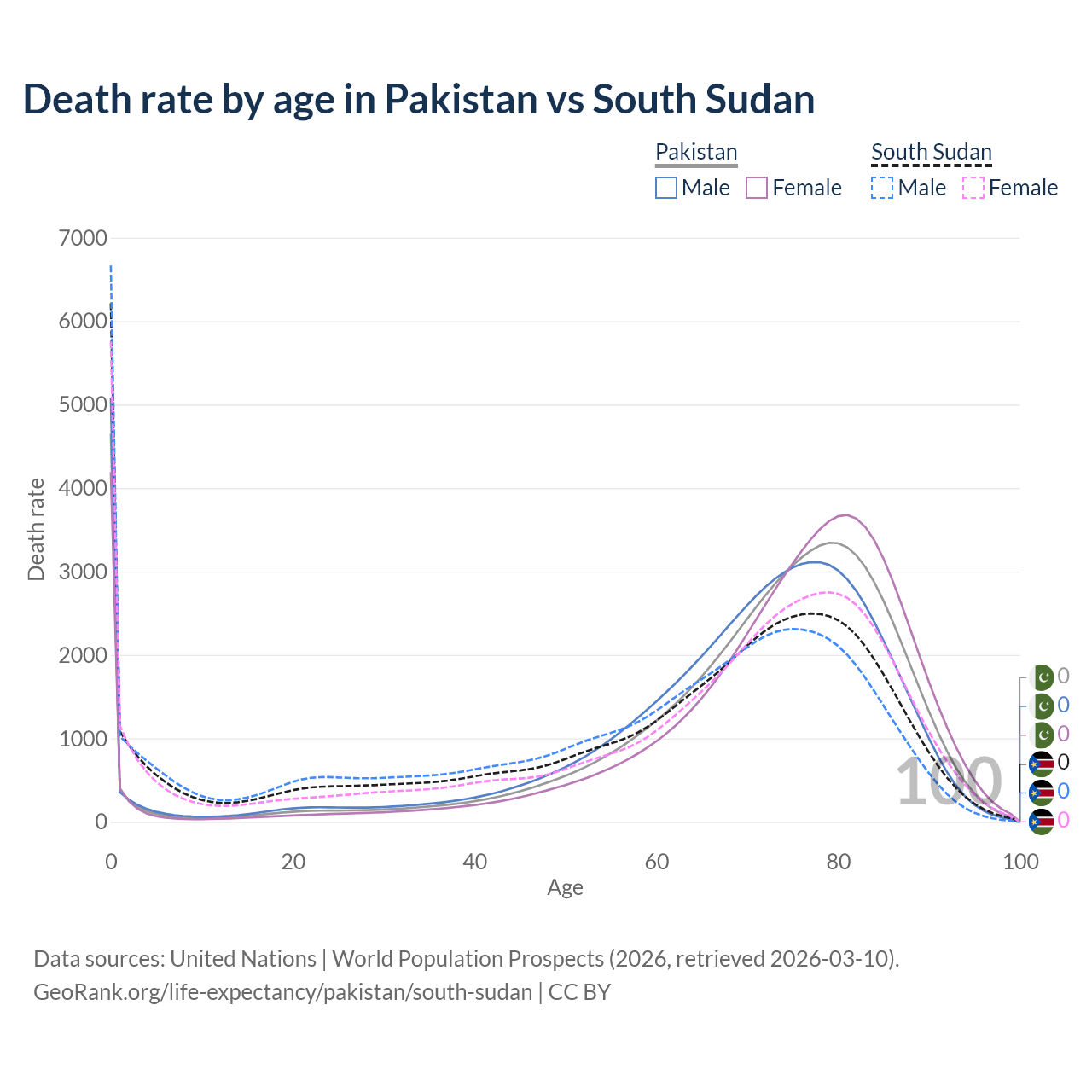 In Pakistan, the most common age of death is 0, compared to 0 in South Sudan. The median age of death is 74.3 in Pakistan and 67.5 in South Sudan, meaning only half of each cohort is expected to live past that age.