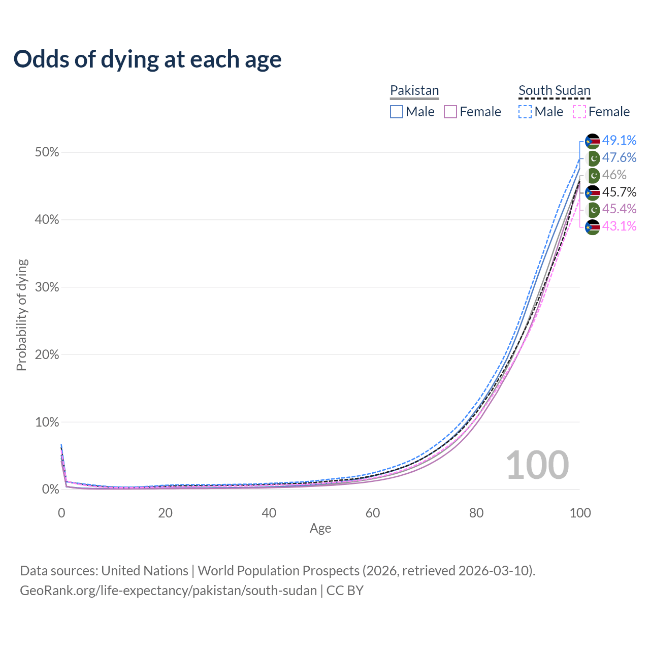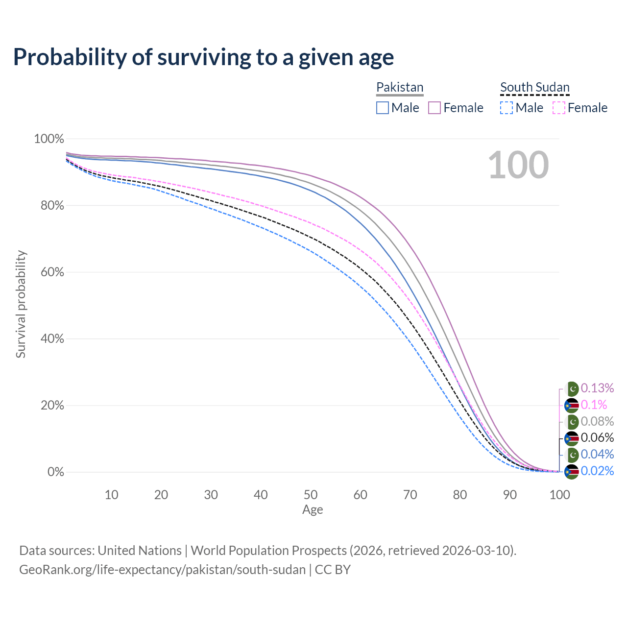 This life expectancy calculator shows the odds of living to 100, 95, 90, and below based on current age for both males and females in Pakistan and South Sudan, along with mean and median age of death. The calculations are based on the 2026 life tables (actuarial tables) from the UN World Population Prospects.