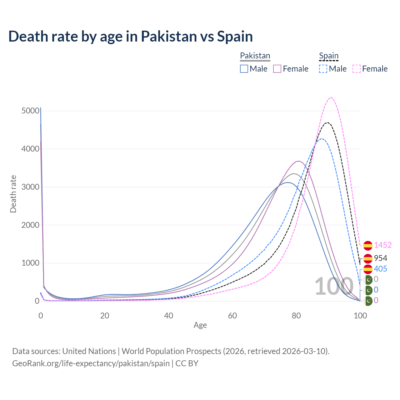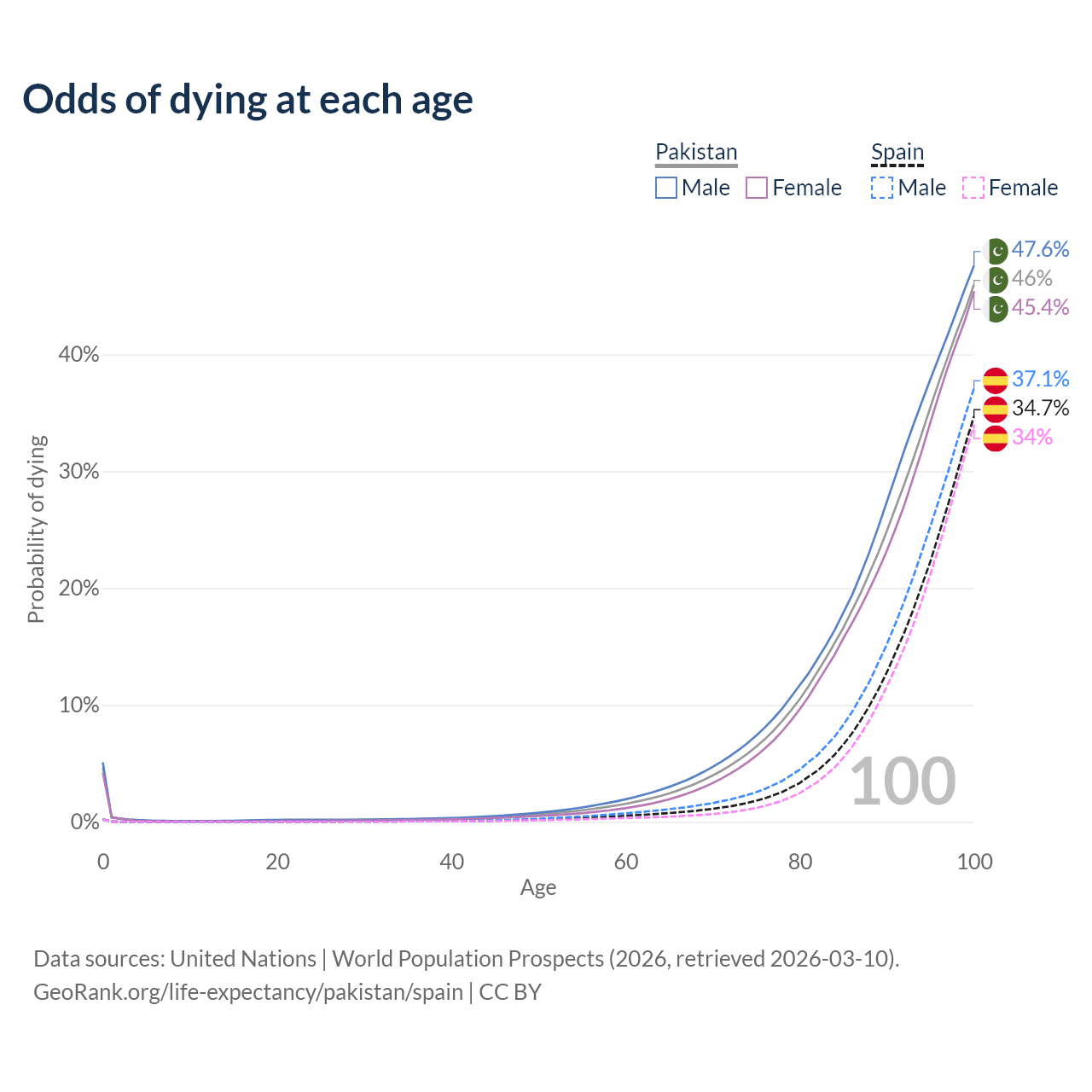 This life expectancy calculator shows the odds of living to 100, 95, 90, and below based on current age for both males and females in Pakistan and Spain, along with mean and median age of death. The calculations are based on the 2026 life tables (actuarial tables) from the UN World Population Prospects.