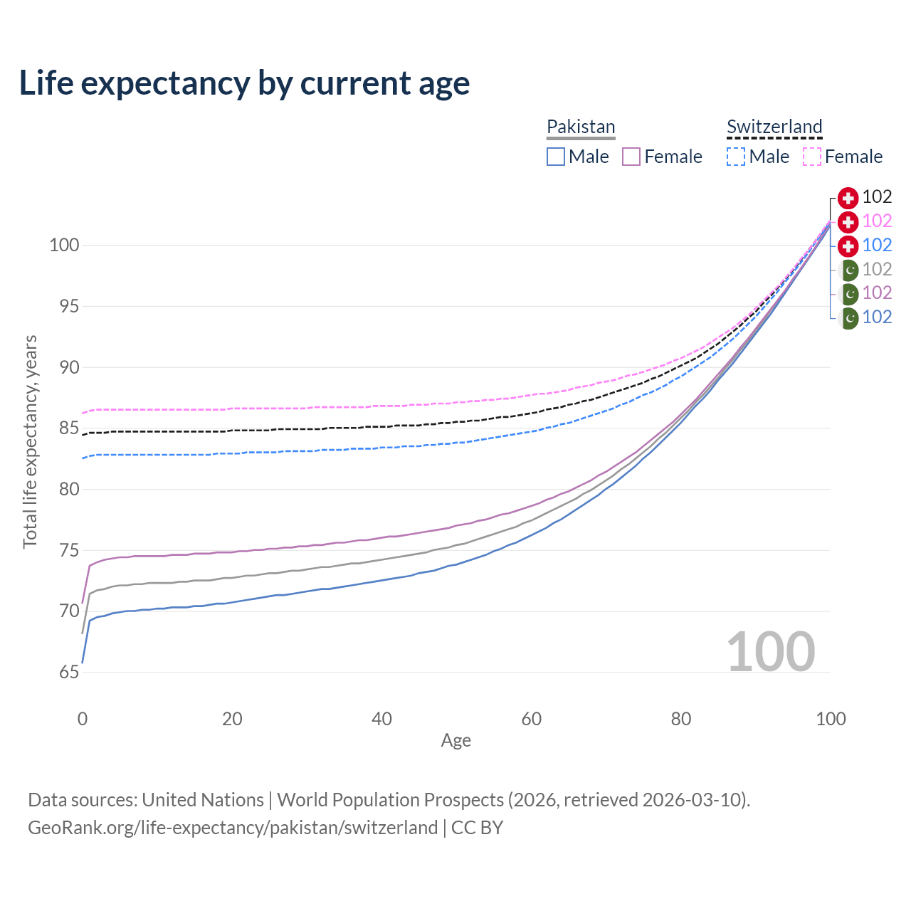 This life expectancy calculator shows the odds of living to 100, 95, 90, and below based on current age for both males and females in Pakistan and Switzerland, along with mean and median age of death. The calculations are based on the 2026 life tables (actuarial tables) from the UN World Population Prospects.
