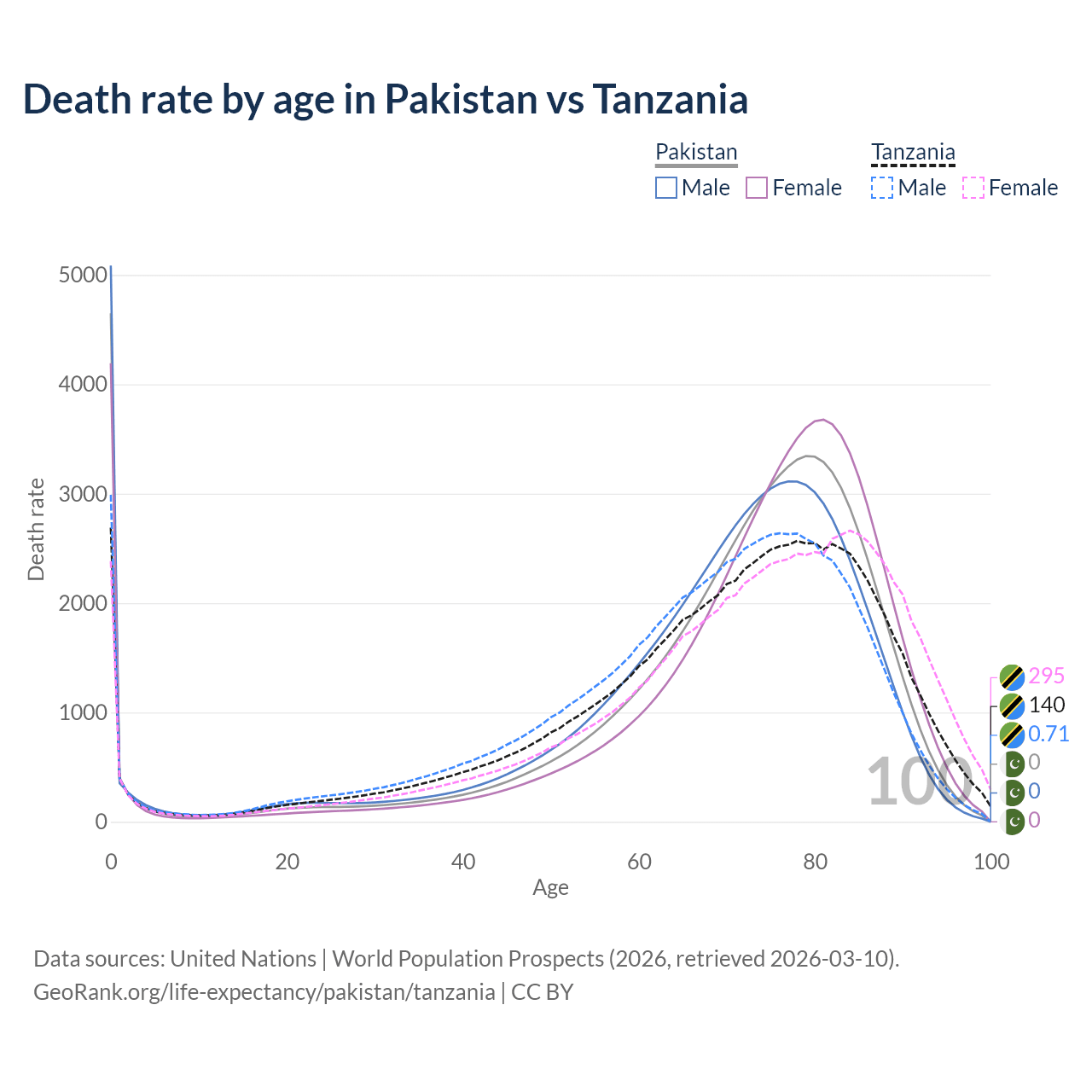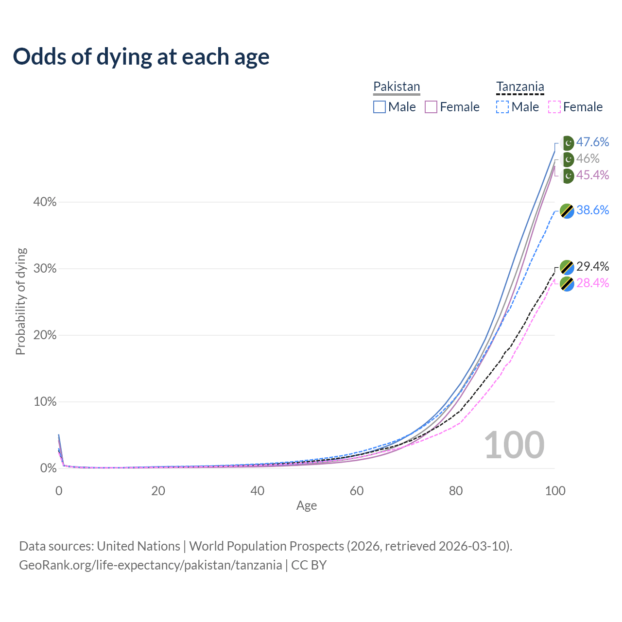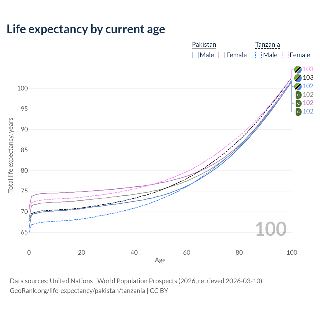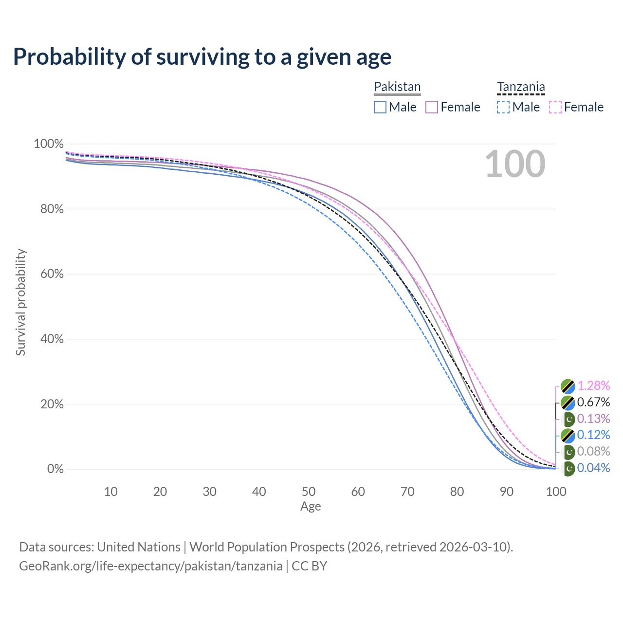 This life expectancy calculator shows the odds of living to 100, 95, 90, and below based on current age for both males and females in Pakistan and Tanzania, along with mean and median age of death. The calculations are based on the 2026 life tables (actuarial tables) from the UN World Population Prospects.