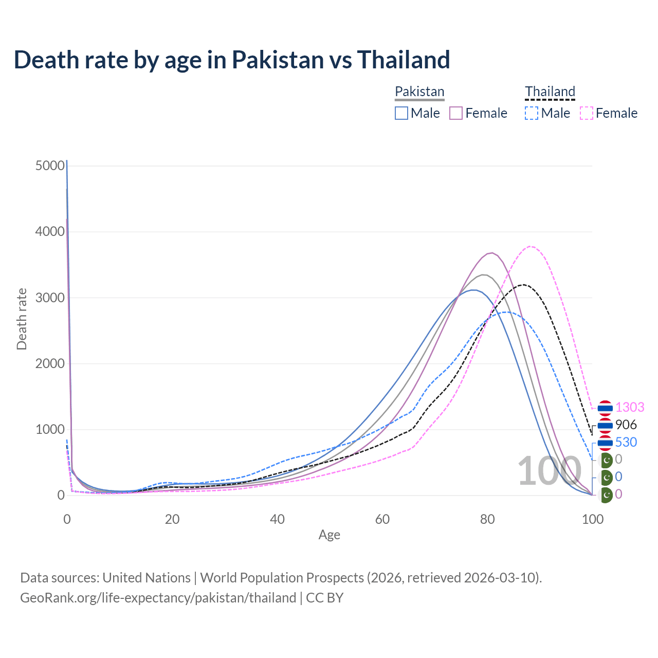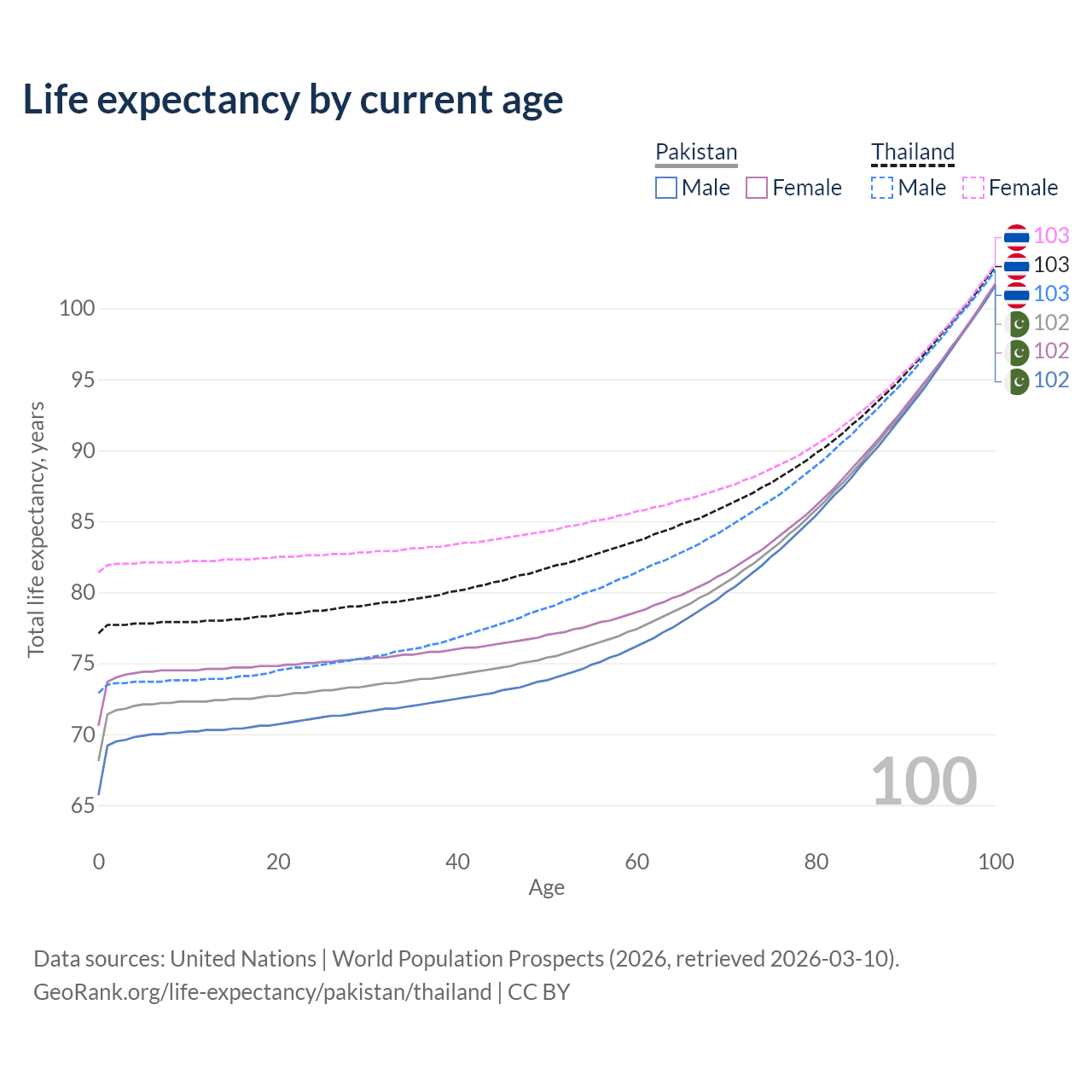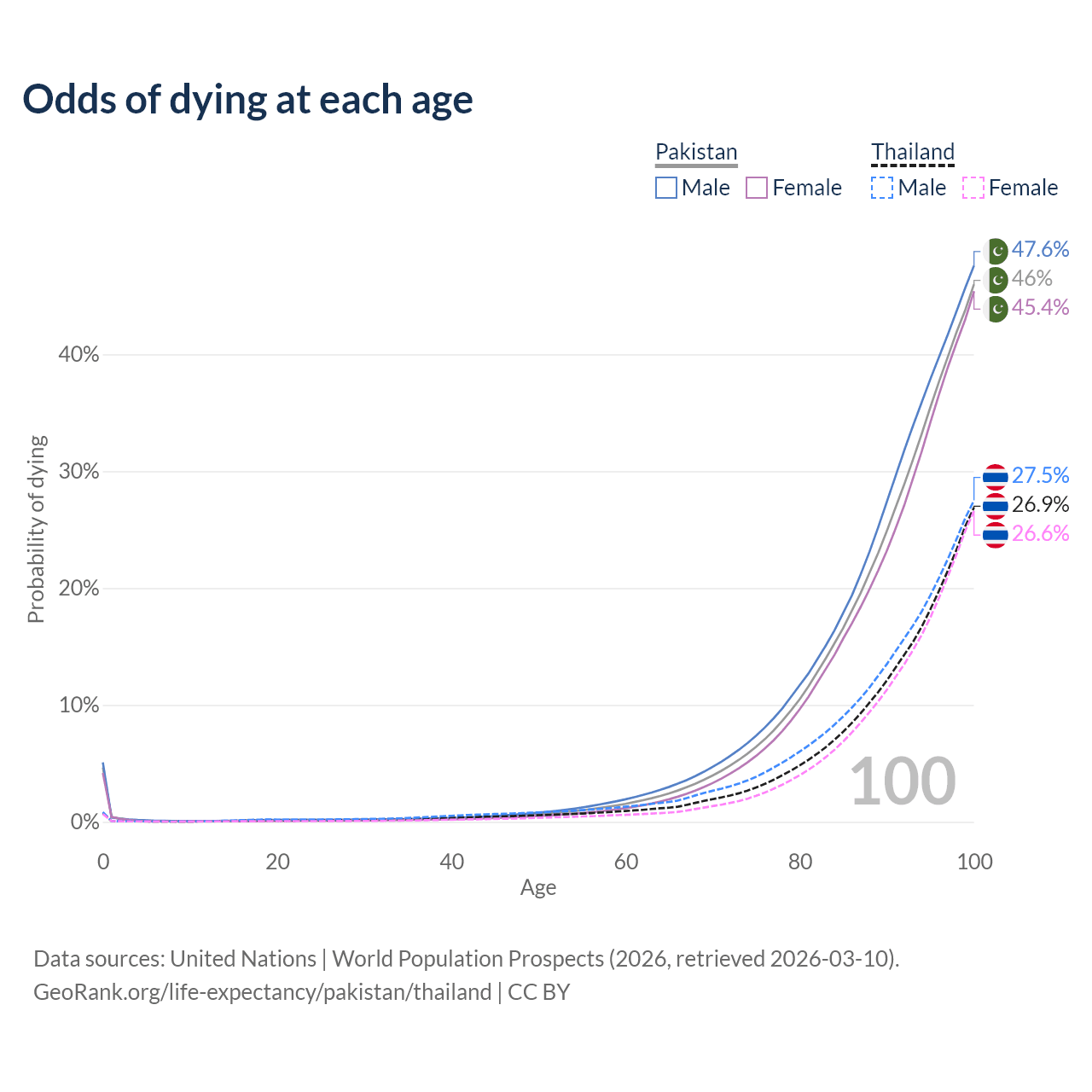 This life expectancy calculator shows the odds of living to 100, 95, 90, and below based on current age for both males and females in Pakistan and Thailand, along with mean and median age of death. The calculations are based on the 2026 life tables (actuarial tables) from the UN World Population Prospects.