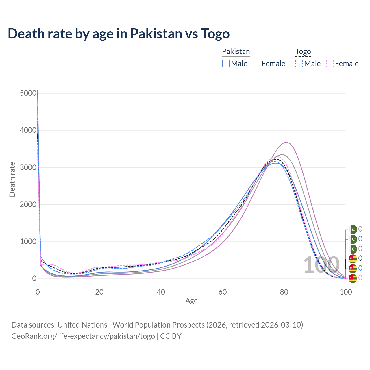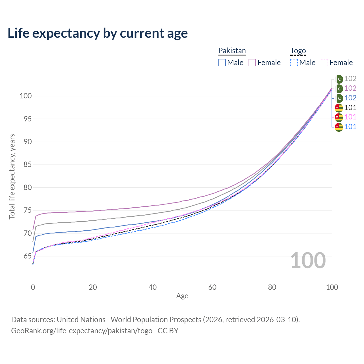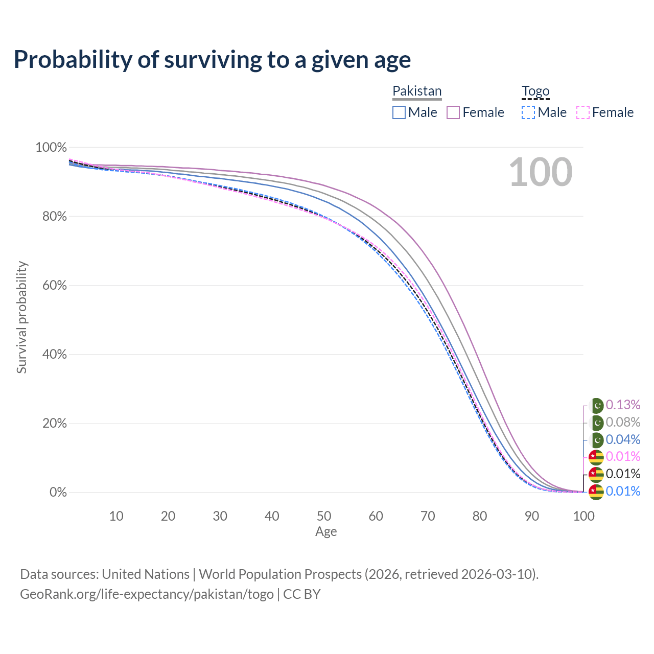 This life expectancy calculator shows the odds of living to 100, 95, 90, and below based on current age for both males and females in Pakistan and Togo, along with mean and median age of death. The calculations are based on the 2026 life tables (actuarial tables) from the UN World Population Prospects.