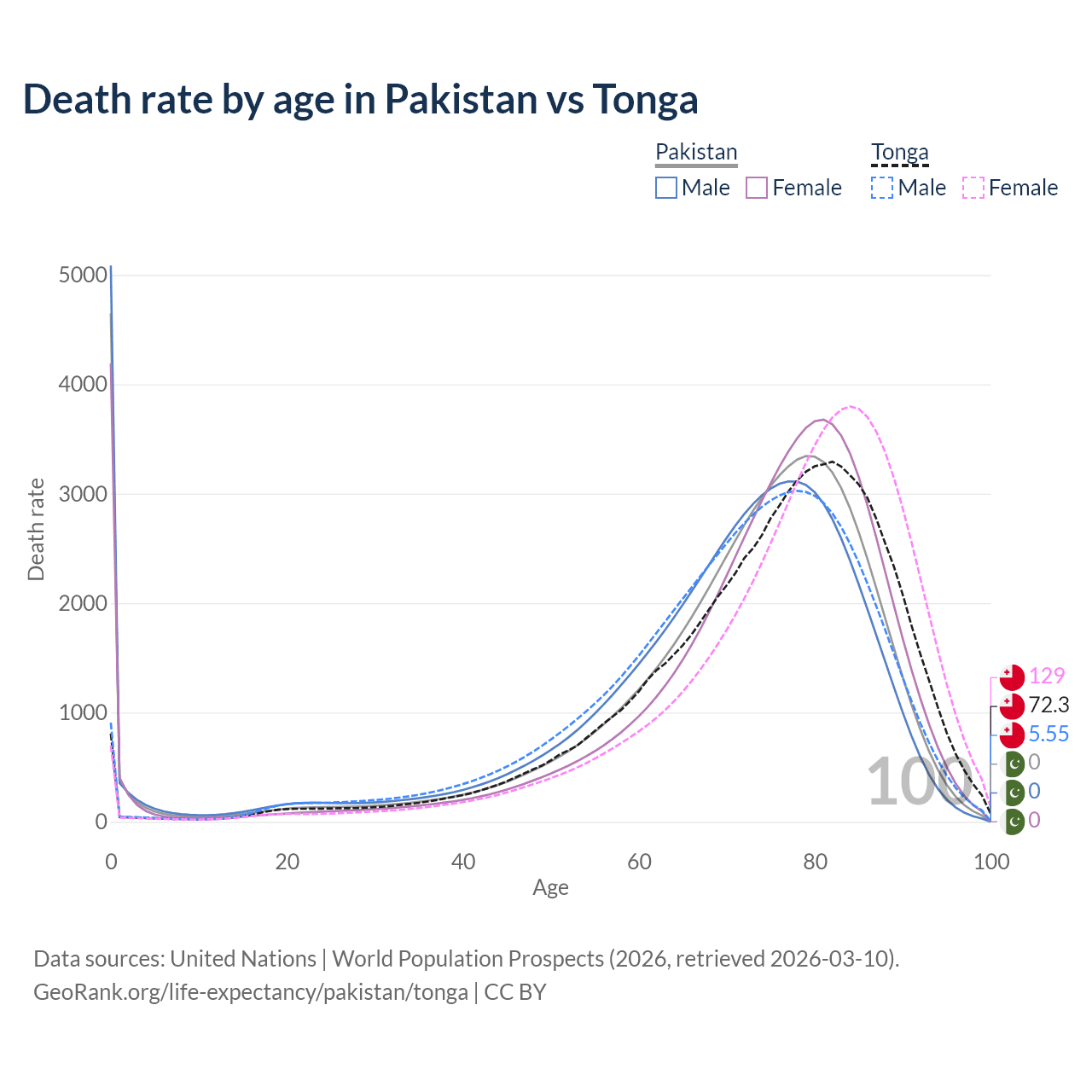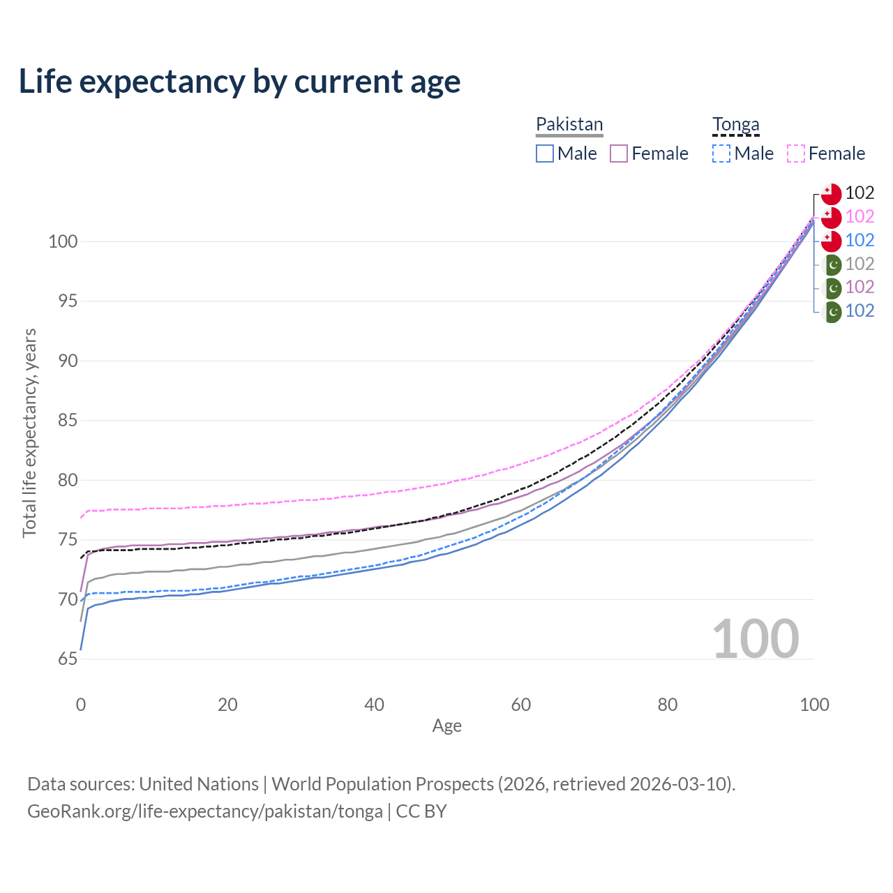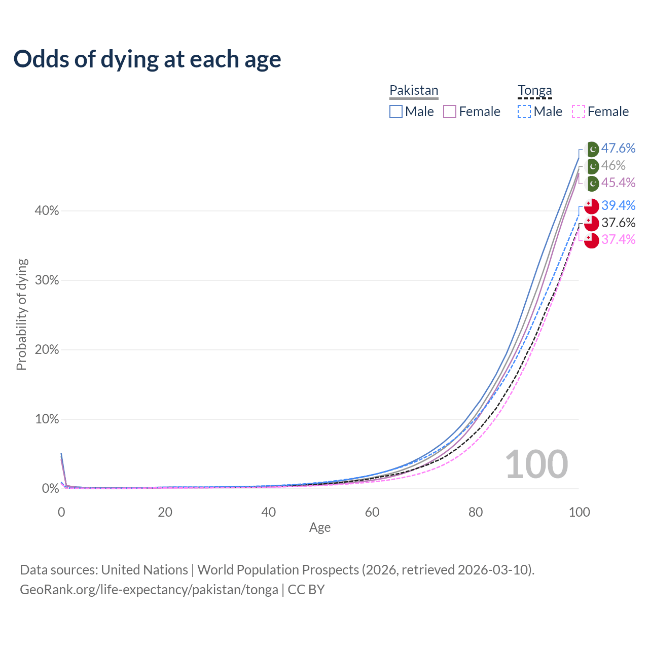 This life expectancy calculator shows the odds of living to 100, 95, 90, and below based on current age for both males and females in Pakistan and Tonga, along with mean and median age of death. The calculations are based on the 2026 life tables (actuarial tables) from the UN World Population Prospects.
