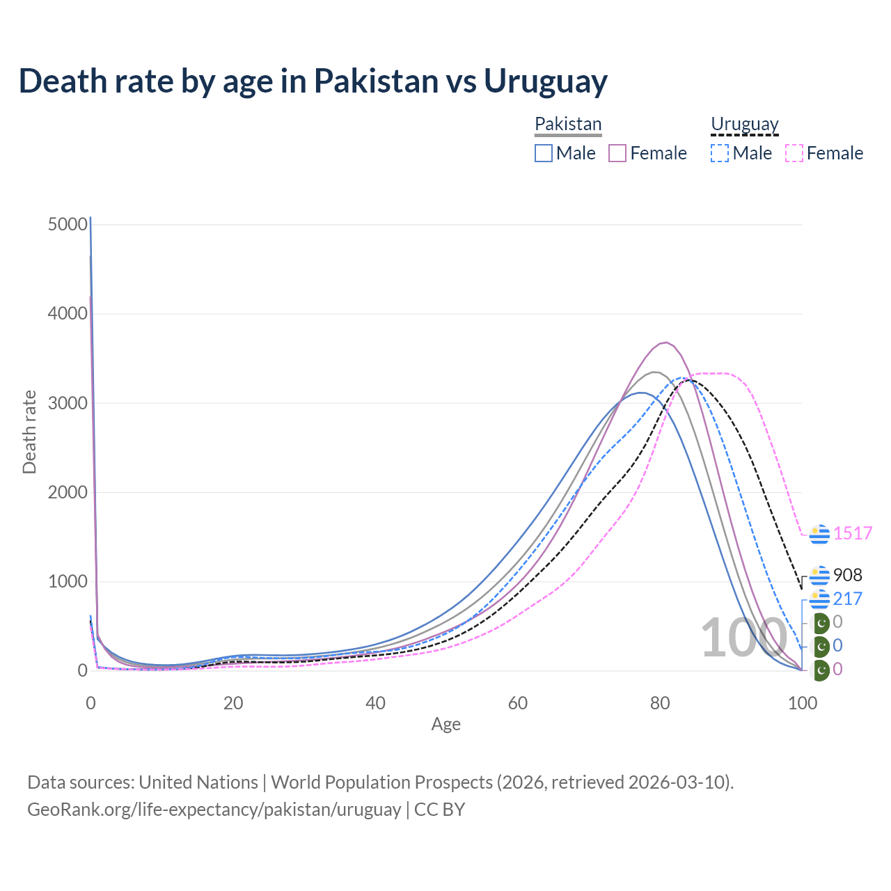 In Pakistan, the most common age of death is 0, compared to 84 in Uruguay. The median age of death is 74.3 in Pakistan and 81.8 in Uruguay, meaning only half of each cohort is expected to live past that age.