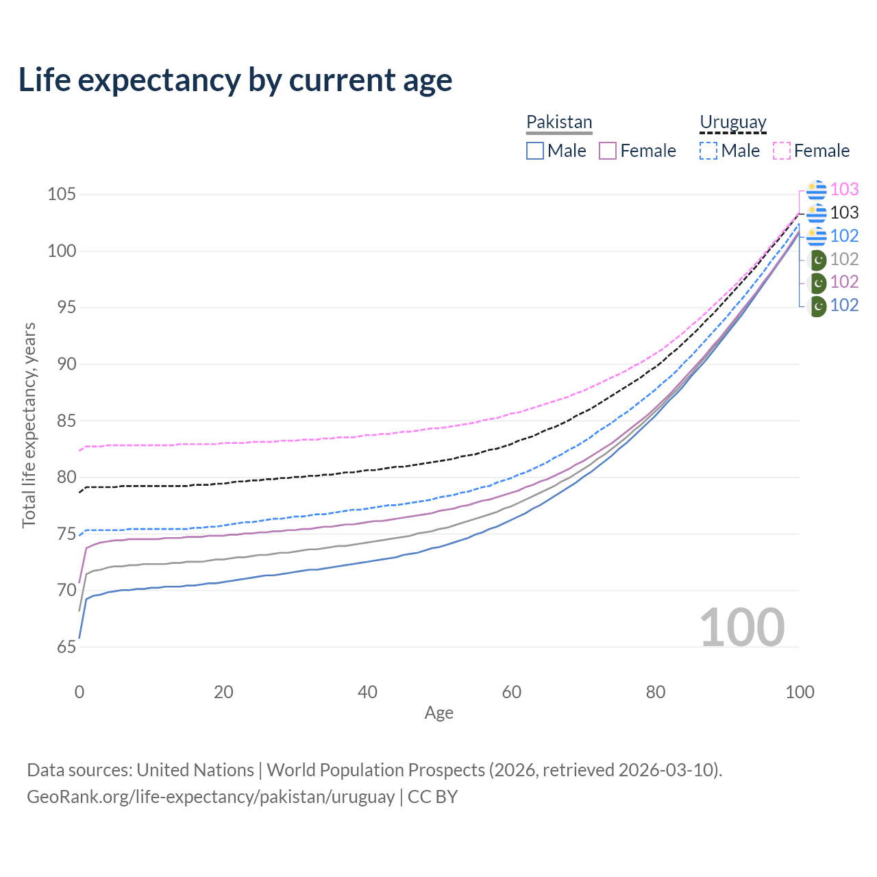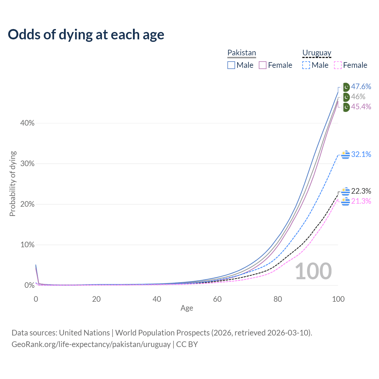 This life expectancy calculator shows the odds of living to 100, 95, 90, and below based on current age for both males and females in Pakistan and Uruguay, along with mean and median age of death. The calculations are based on the 2026 life tables (actuarial tables) from the UN World Population Prospects.