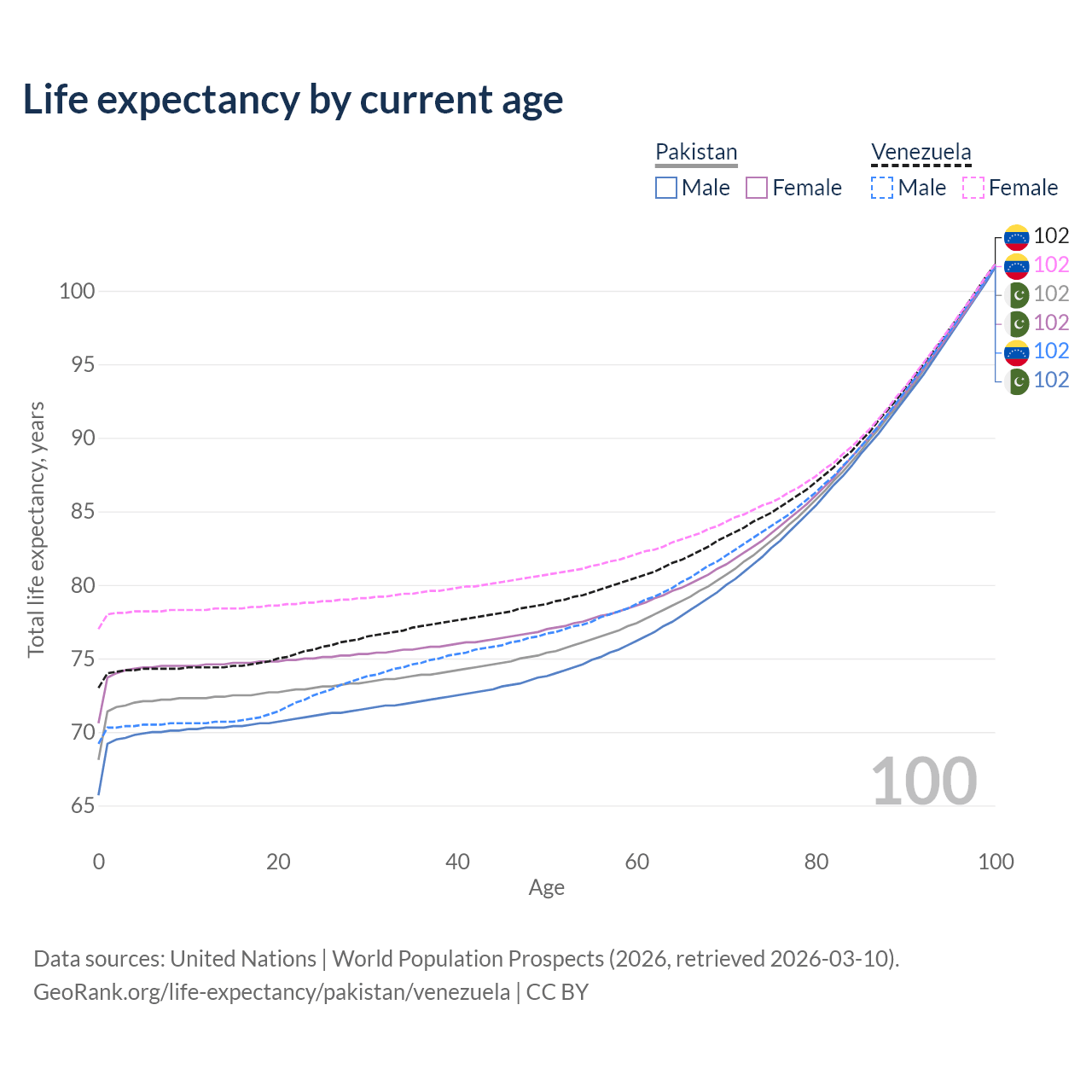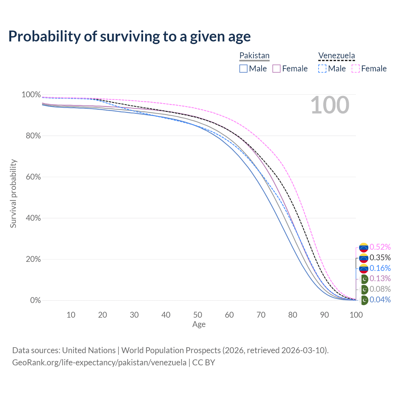 This life expectancy calculator shows the odds of living to 100, 95, 90, and below based on current age for both males and females in Pakistan and Venezuela, along with mean and median age of death. The calculations are based on the 2026 life tables (actuarial tables) from the UN World Population Prospects.