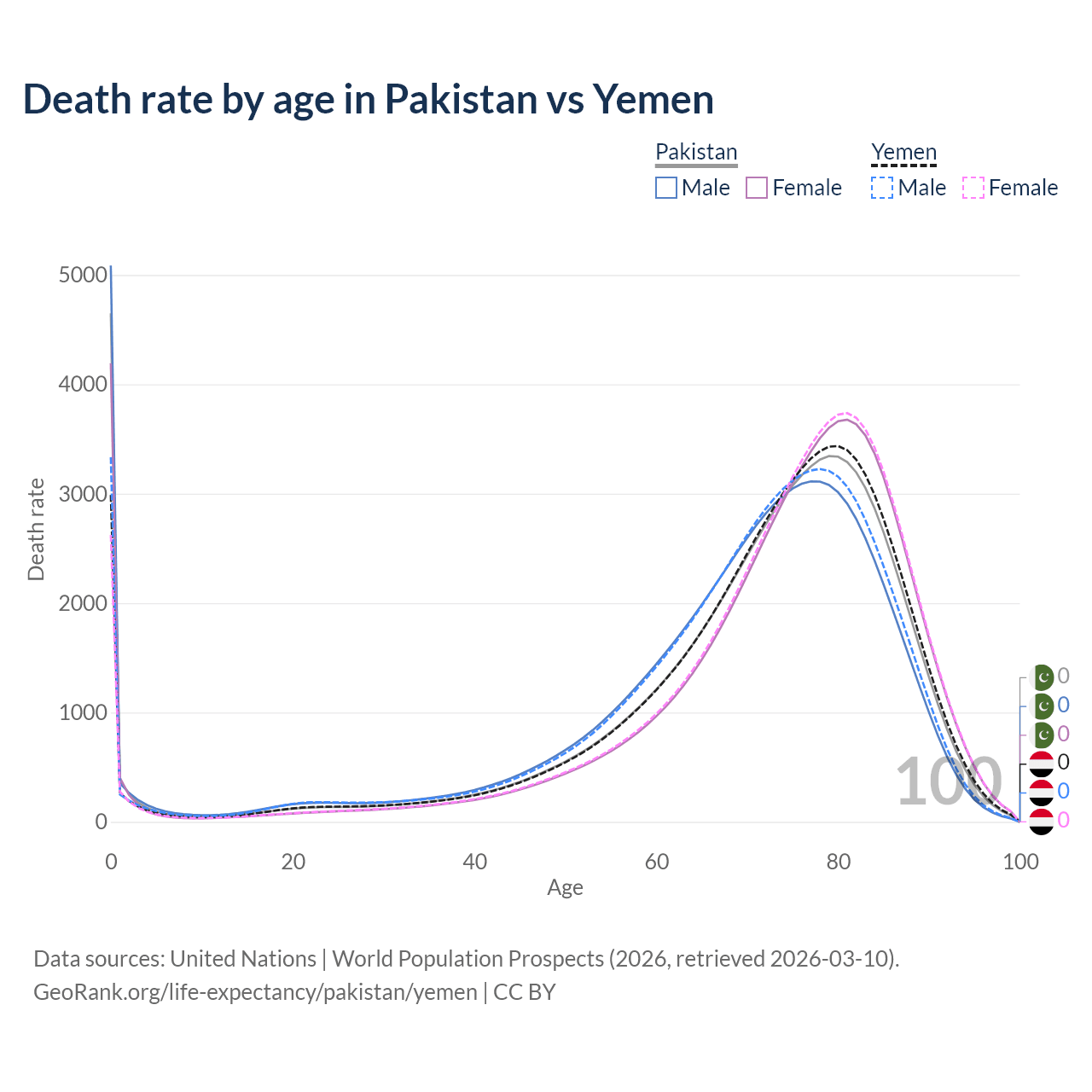 In Pakistan, the most common age of death is 0, compared to 80 in Yemen. The median age of death is 74.3 in Pakistan and 74.9 in Yemen, meaning only half of each cohort is expected to live past that age.