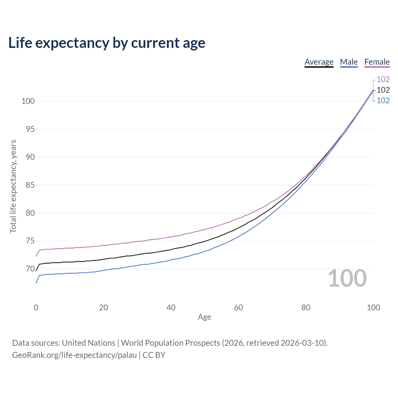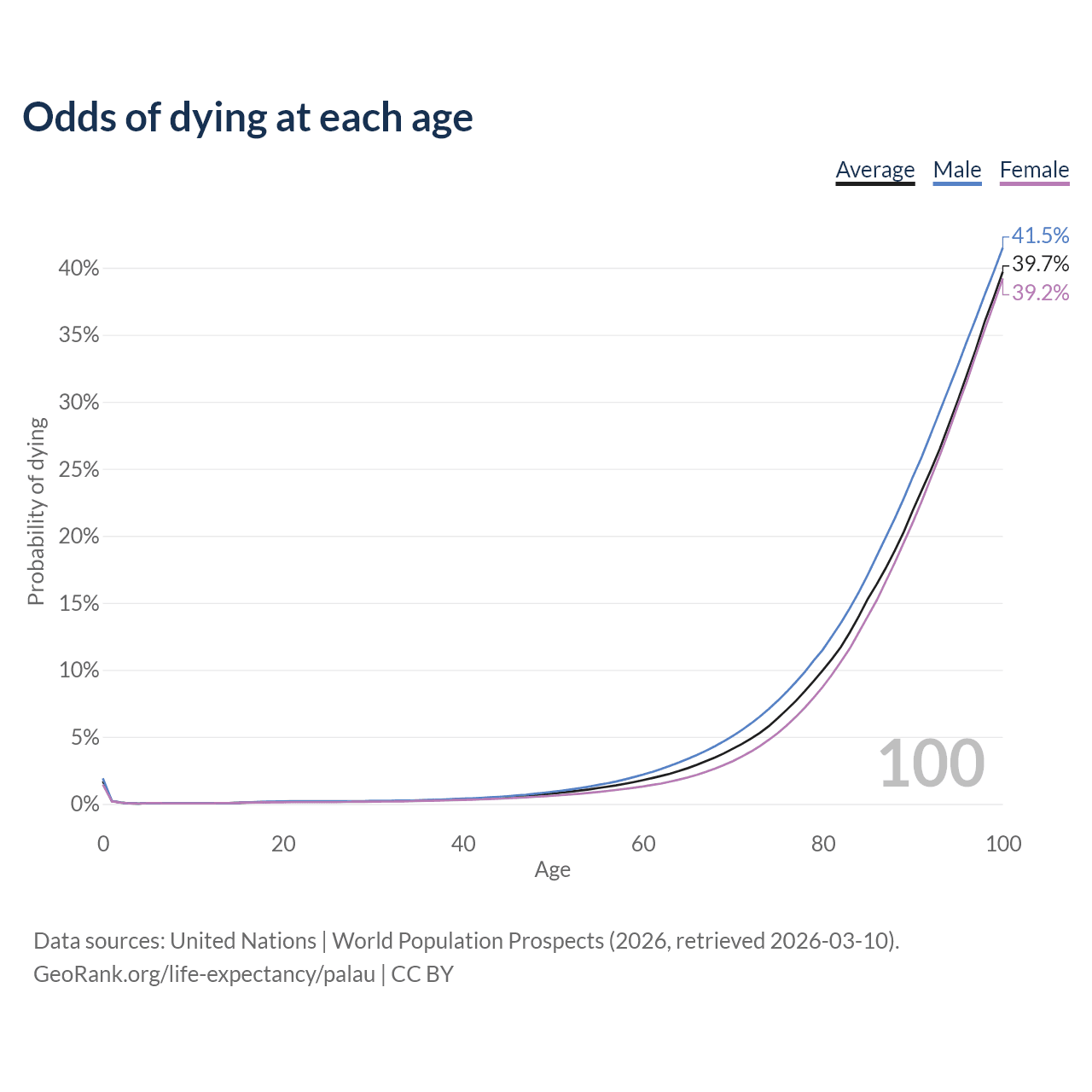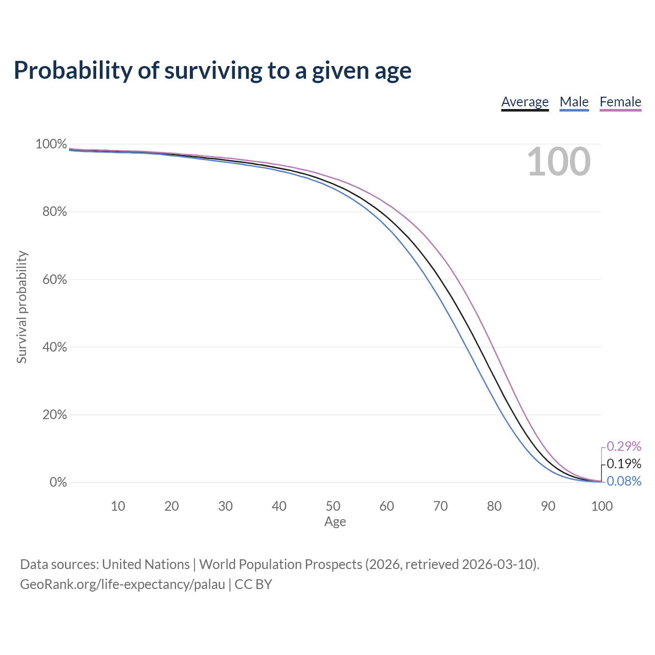 This life expectancy calculator shows the odds of living to 100, 95, 90, and below based on current age for both males and females in Palau, along with mean and median age of death. The calculations are based on the 2026 life tables (actuarial tables) from the UN World Population Prospects.